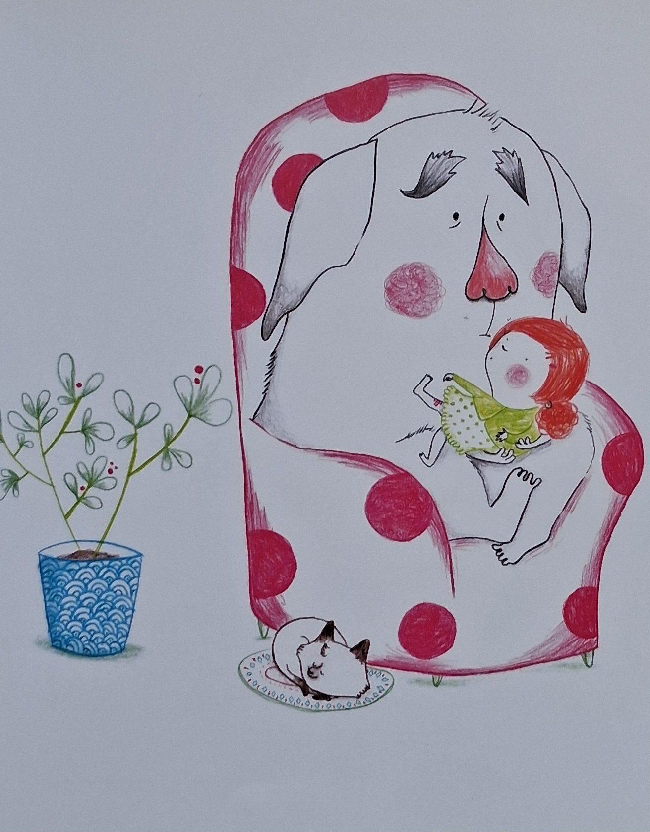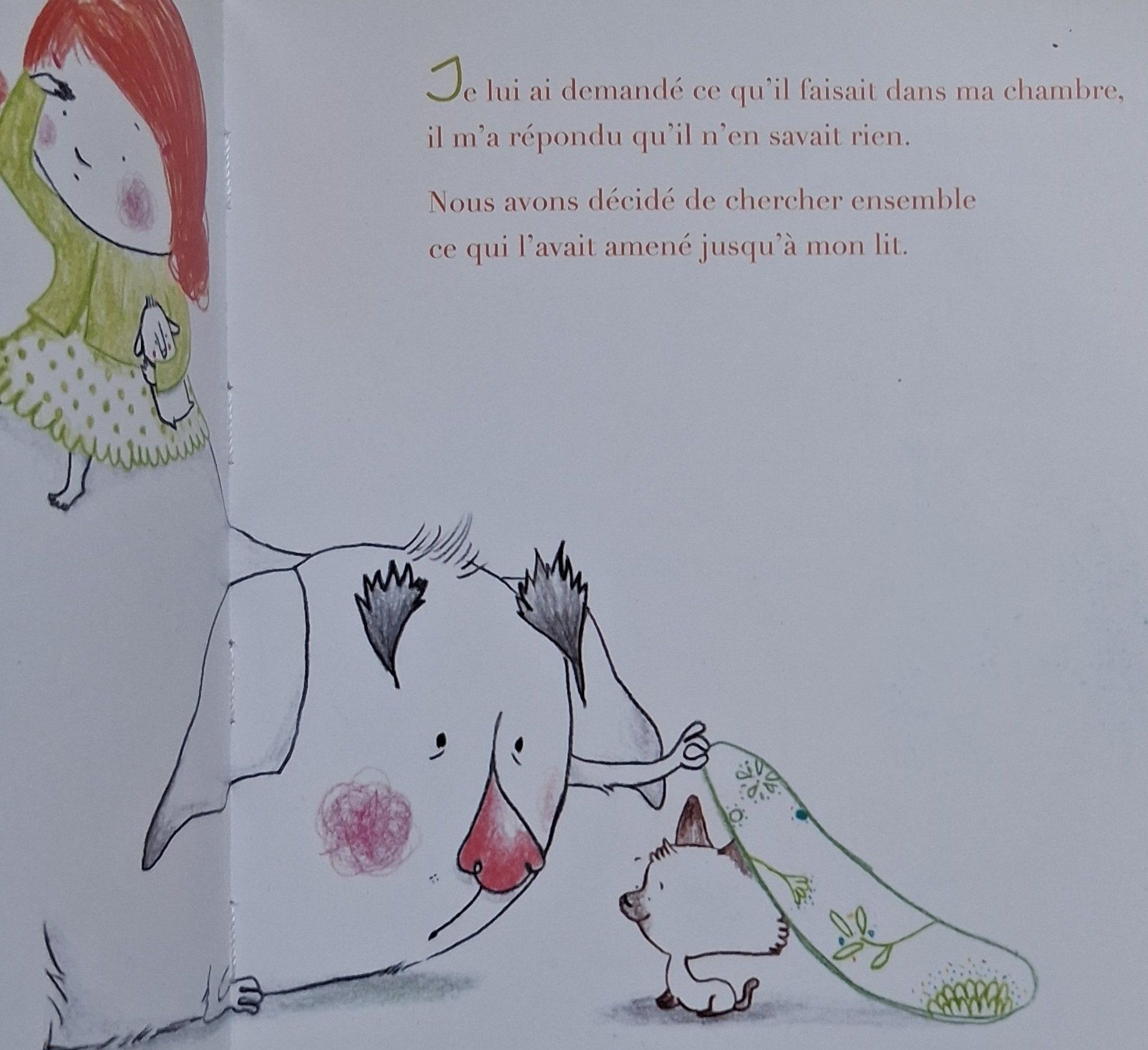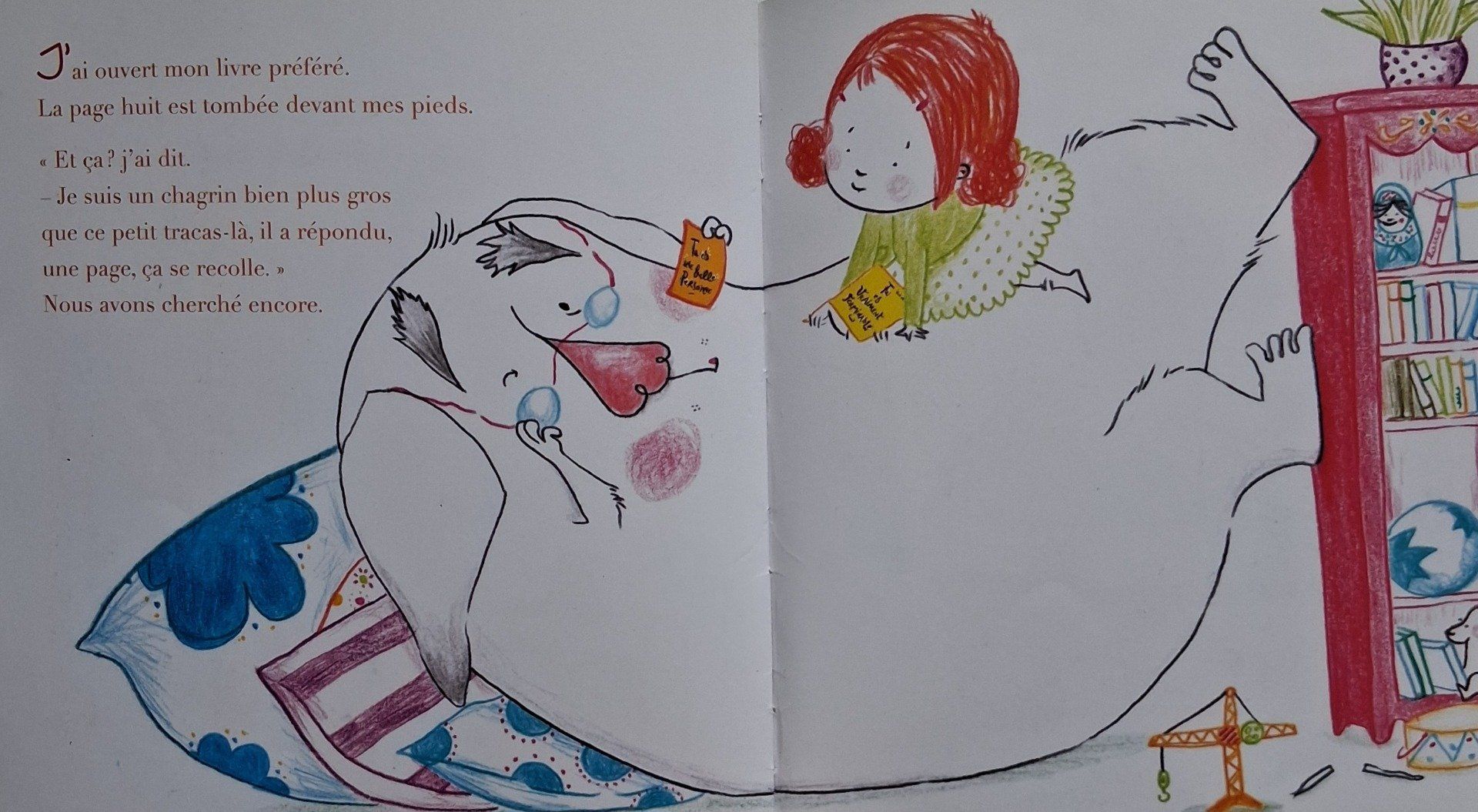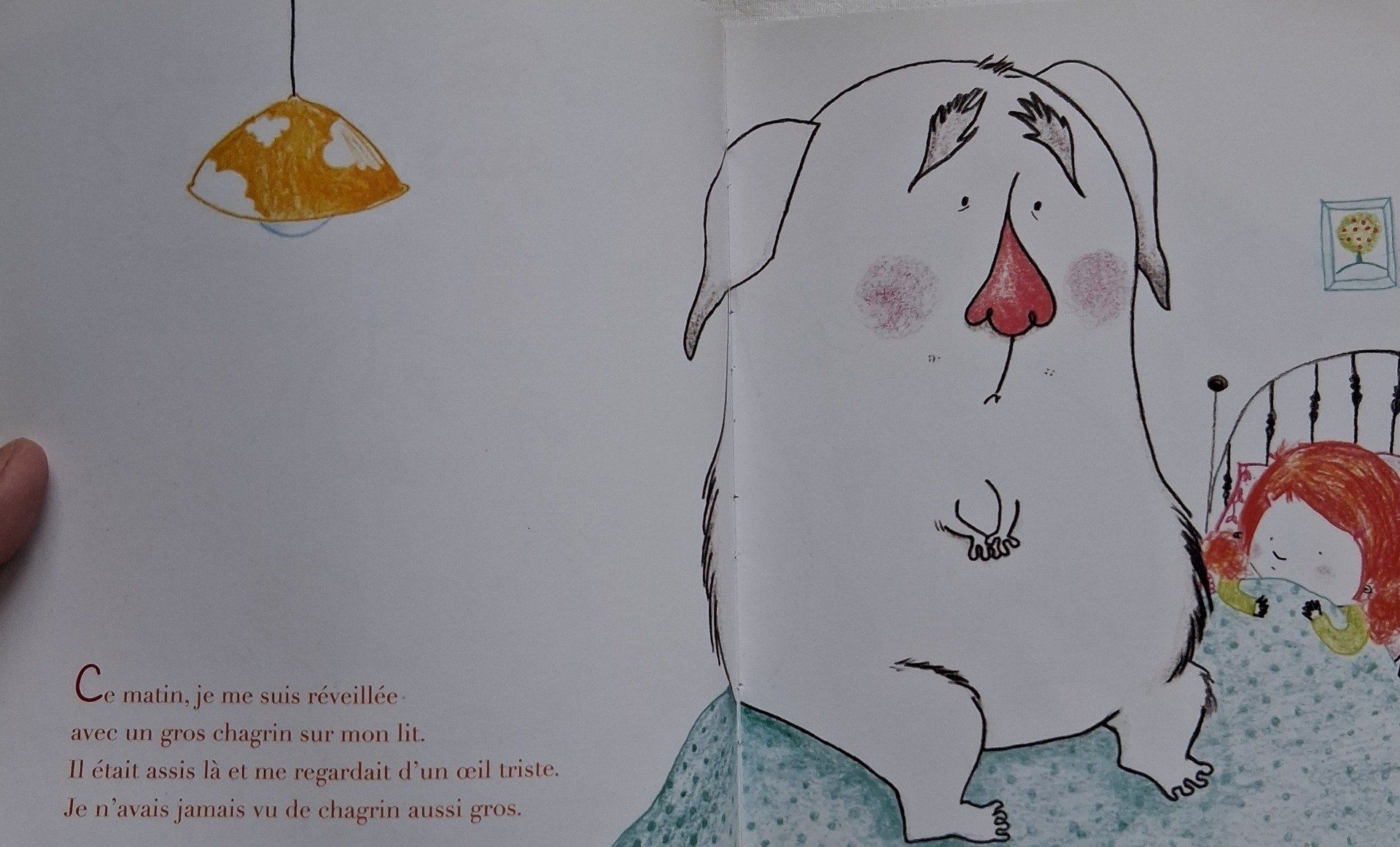 Un matin, une petite fille se réveille avec un gros chagrin sur son lit. Jamais elle n'a vu de chagrin aussi gros. Elle décide de chercher ce qui a bien pu l'amener jusqu'à elle : est-ce le bobo sur son genou, l'oreille décousue de son ours en peluche ou encore la boîte de biscuits vide ? Impossible de savoir. Alors elle essaie de le faire rire, pour qu'il soit moins gros… et le gros chagrin devient si petit qu'il disparaît dans sa poche.