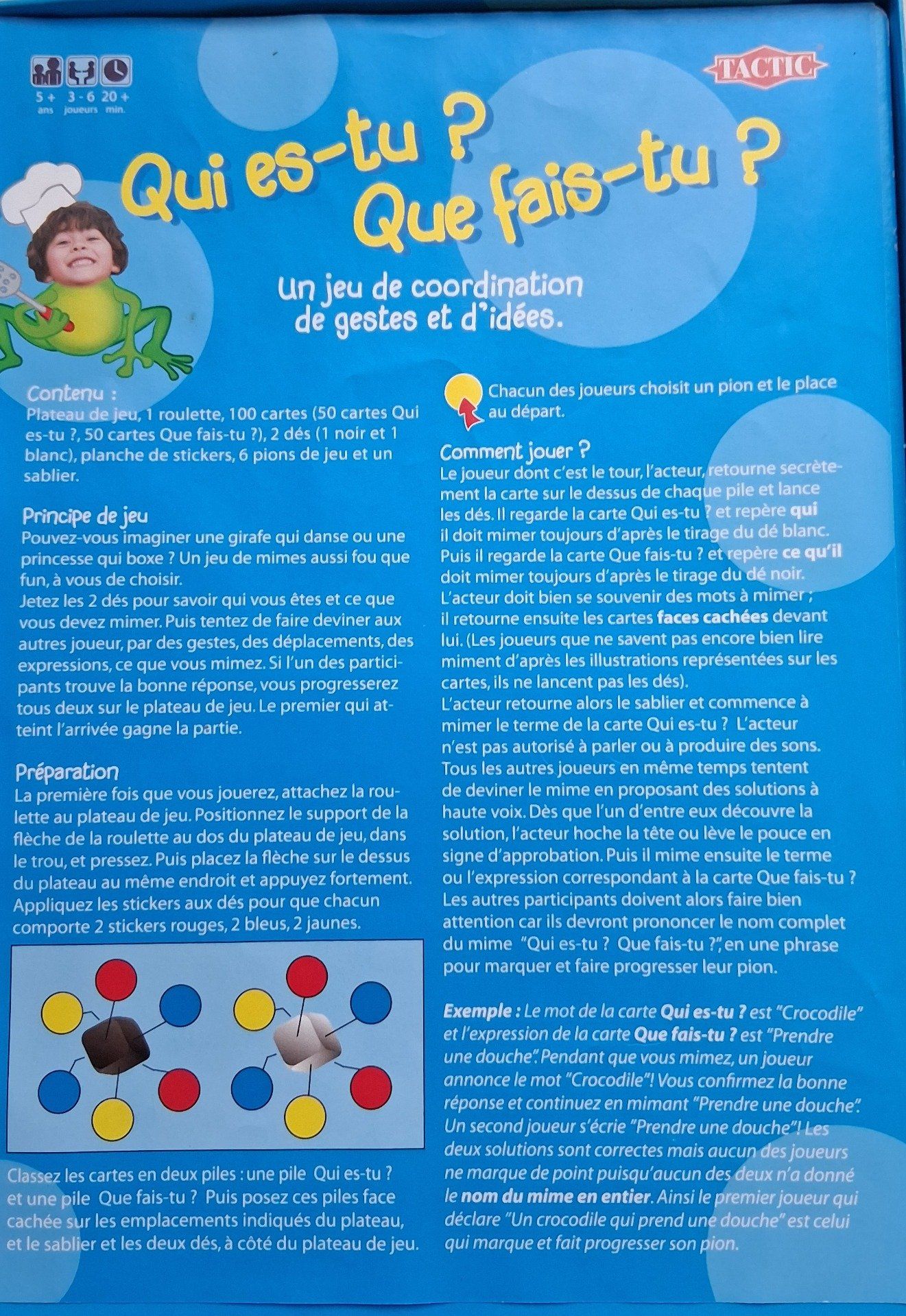 Un jeu de coordination de gestes et d’idées. Que les enfants sachent lire ou qu’ils ne sachent pas lire, ils pourront jouer de façon autonome avec des joueurs de tout âge. Les deux dés indiqueront le personnage et l’action que le comédien -différents à chaque tour- devra faire deviner aux spectateurs. Le premier des spectateurs qui trouve, ainsi que le comédien qui lui a permis de trouver, progresseront sur le plateau de jeu. Et attention au coup de théâtre sur certaines cases !