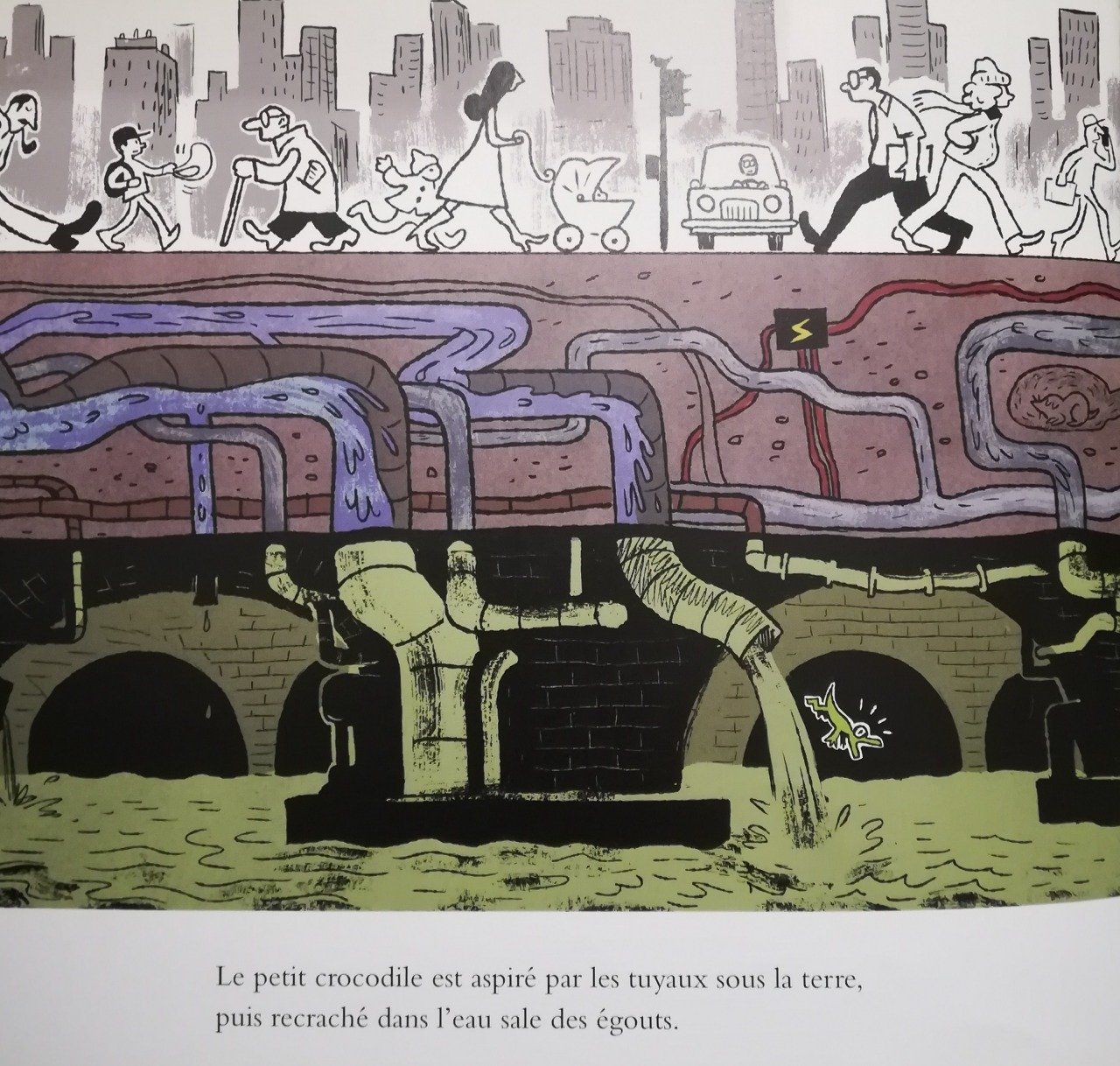 Pauvre petit crocodile ! Un jour, son propriétaire en a eu marre, il l'a jeté dans les toilettes pour se débarrasser de lui, sans lui avoir jamais donné de nom. Heureusement, il est débrouillard, et les histoires qu'il regardait la nuit, à la télévision, à travers les parois de son vivarium miniature, lui ont donné des idées... Incroyable mais vrai : c'est au fond des égouts, parmi les animaux bannis, rats, araignées, poissons bizarres, qu'il va trouver un peu de chaleur humaine... et un nom magnifique !