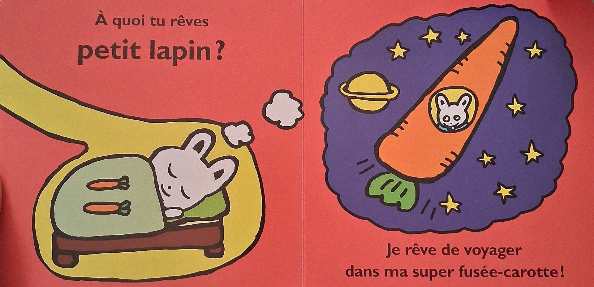 Tout le monde rêve ! Le petit chat rêve de prendre un bain de lait, le petit singe lui, rêve de glisser sur une banane, et le lion rêve d’être le roi ! Et toi, à quoi rêves-tu ?