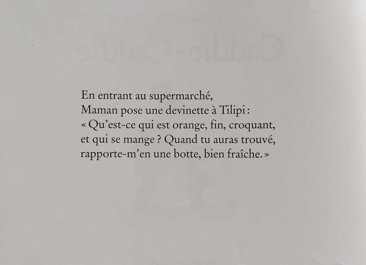 On peut faire les courses en s'amusant. En entrant au supermarché, Maman Lapine demande à sa fille Tilipi de trouver quelque chose d' "orange, fin et croquant et qui se mange ? " . Les cerises sont croquantes, mais pas très fines. Les baguettes sont croquantes et fines, mais pas très oranges...