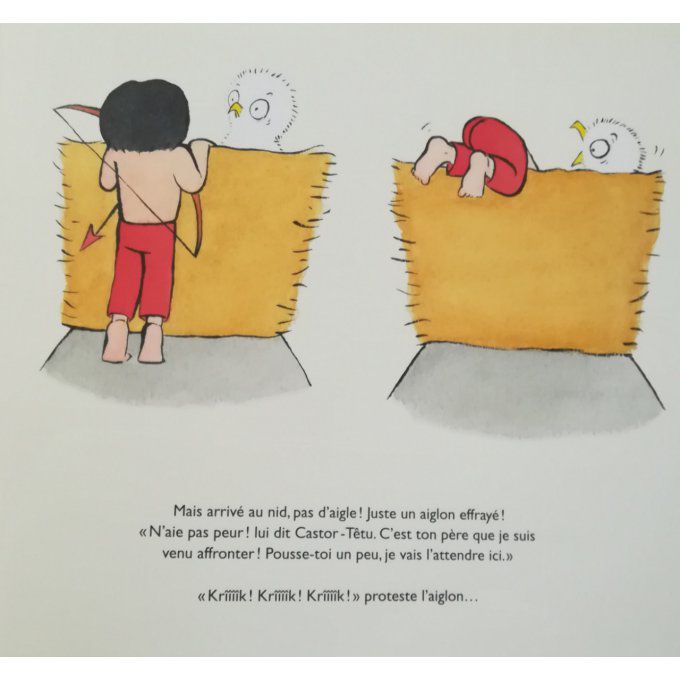 "Castor-Têtu le papoose a cinq ans et il a décidé de devenir un vrai brave. À l âge où d autres gagnent leur premier flocon, lui veut affronter l aigle et gagner sa première plume, pour orner sa coiffe. Son père lui donne un arc et une flèche, sa mère un sac de provisions, et le voilà parti. Castor-Têtu porte bien son nom et rien ne pourra l arrêter. La montagne est haute, la route difficile, et dans le nid, il n y a qu un aiglon effrayé, plutôt déplumé... et bientôt menacé par un vilain vautour. Heureusement pour lui, les vrais braves, même les plus jeunes, savent comment agir en toute circonstance !"