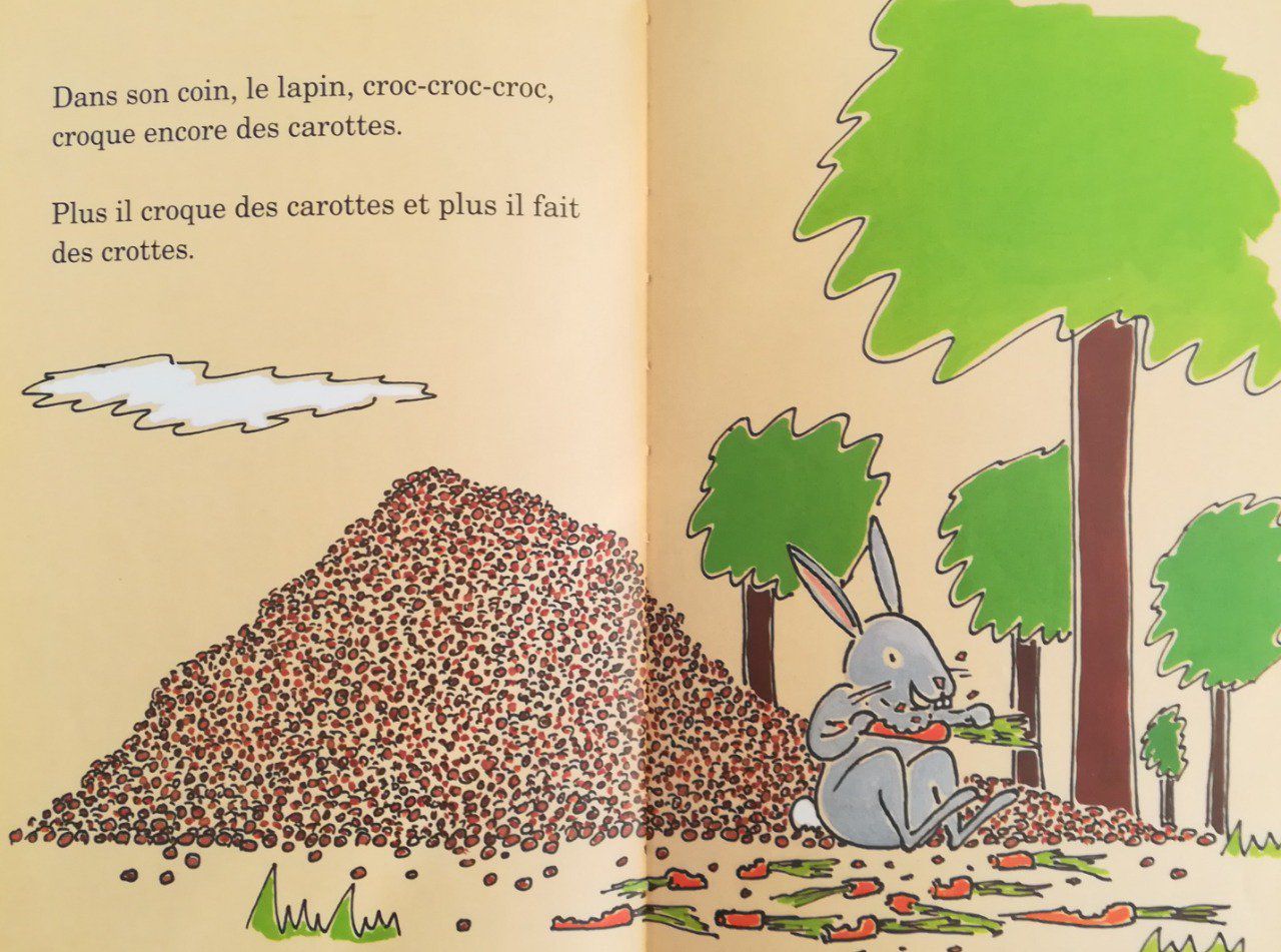 C'est l'histoire d'un petit lapin qui a toujours faim. Il croque des carottes puis il fait des crottes n'importe où...
