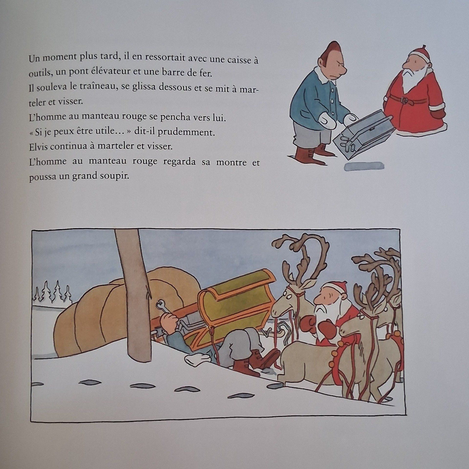 Sans s'attarder sur le look étrange du vieux bonhomme, Elvis rechigne, bougonne, mais tente de réparer le véhicule... sans succès ! En même temps, un traîneau n'est quand même pas un engin bien pratique... Débarquent Ernest, de la casse auto, avec la mauvaise pièce de rechange, Herbert, le voisin paysan et sa charrette de foin pour des rennes affamés, le grand-père à la mémoire qui flanche... Une histoire loufoque, aux protagonistes aussi déjantés qu'attachants, où l'on n'apprendra pas le nom de l'homme au manteau rouge.