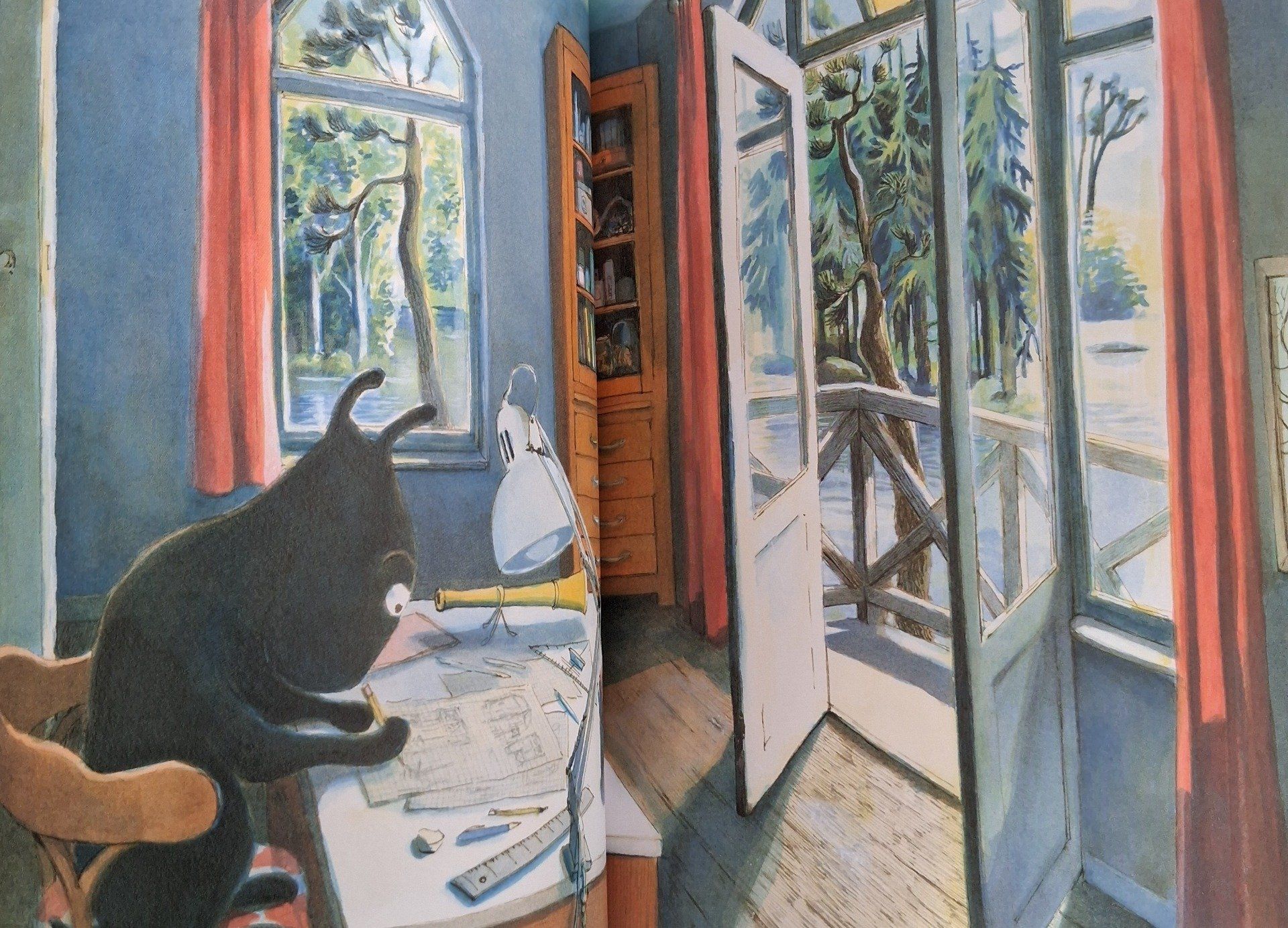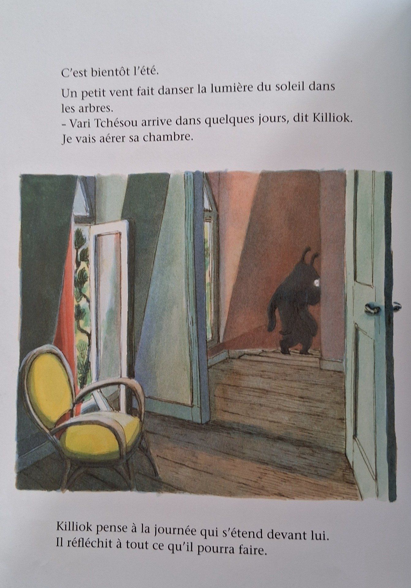 C’est bientôt l’été. Killiok se lève et pense à la journée qui s’étend devant lui. Il fait beau, il boit son café dehors. Une terrasse devant la maison serait vraiment bien. Pendant de longues heures, Killiok trace des plans. Puis le Chat Mystère arrive en barque et ils discutent. À l’heure du coucher, Killiok se glisse sous sa couette, heureux et tranquille.