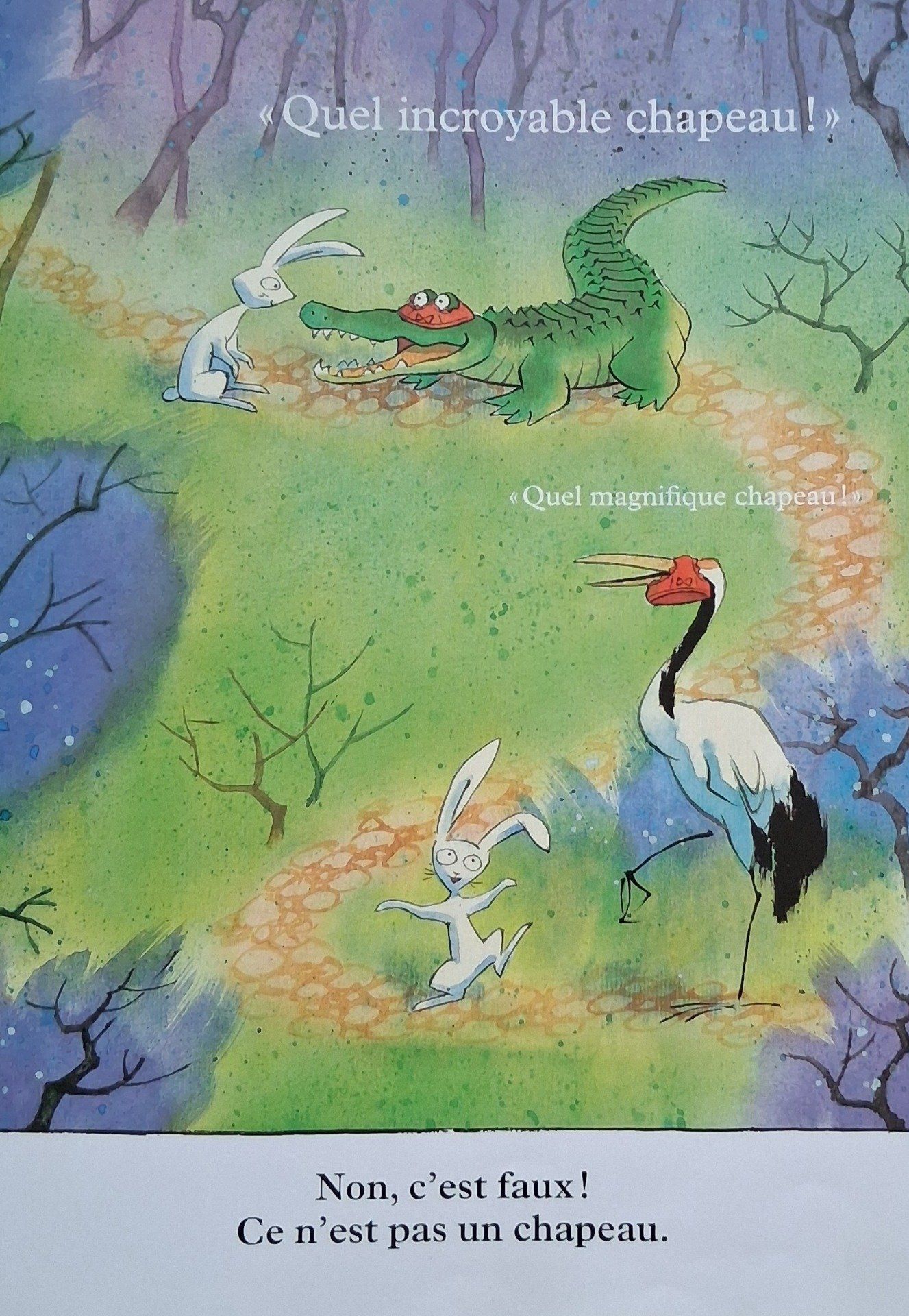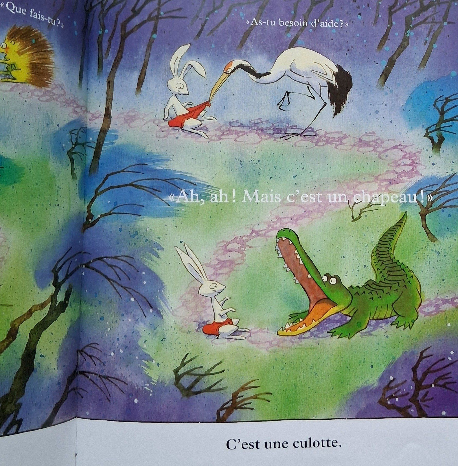 Une pièce de vêtement se détache du fil à linge, à la suite d'un coup de vent. Notre ami le lapin se retrouve avec ce bout de vêtement sur la tête et donc persuadé que c'est une nouvelle sorte de chapeau va faire le fier et présenter sa nouvelle apparence à ses amis, les autres animaux, petits et grands. Tout le monde l'aime bien ce chapeau, tout le monde veut l'essayer, mais curieusement toutes les têtes étant différentes, ce chapeau ne va à personne, sauf à notre ami le lapin.