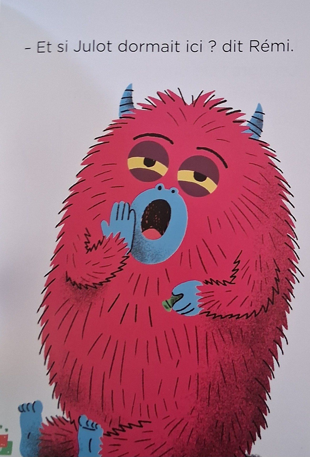 Tu lis, tu ris, mission accomplie ! Ce soir, Julot Monstre reste dormir chez ses copains Mia et Rémi. Mais papa Monstre et maman Monstre sont un peu inquiets. Et si Julot avait peur du noir ? Des monstres de la nuit ? Ils hésitent à partir, écoutent à la porte, regardent au travers de la fenêtre... Mais en s'inquiétant pour leur fils, les parents Monstre font peur aux enfants. Pour avoir la paix, les trois copains trouveront bien une solution : et si toute la famille Monstre dormait à la maison ?