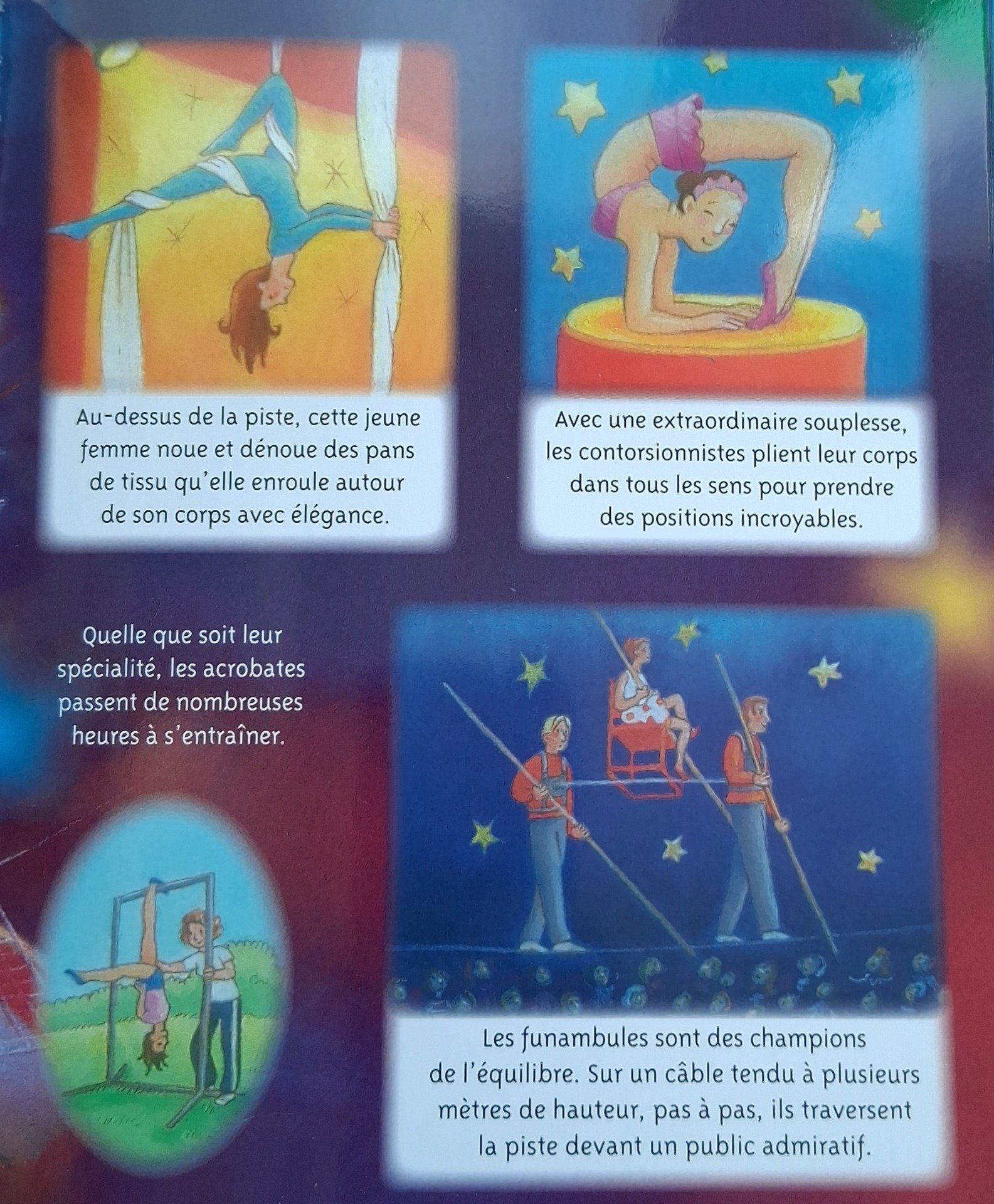 Une visite au cirque pour mieux connaître chaque métier du cirque : les dresseurs, les jongleurs, les acrobates. La vie quotidienne des enfants. Le dressage des animaux. Comment on dresse le chapiteau...