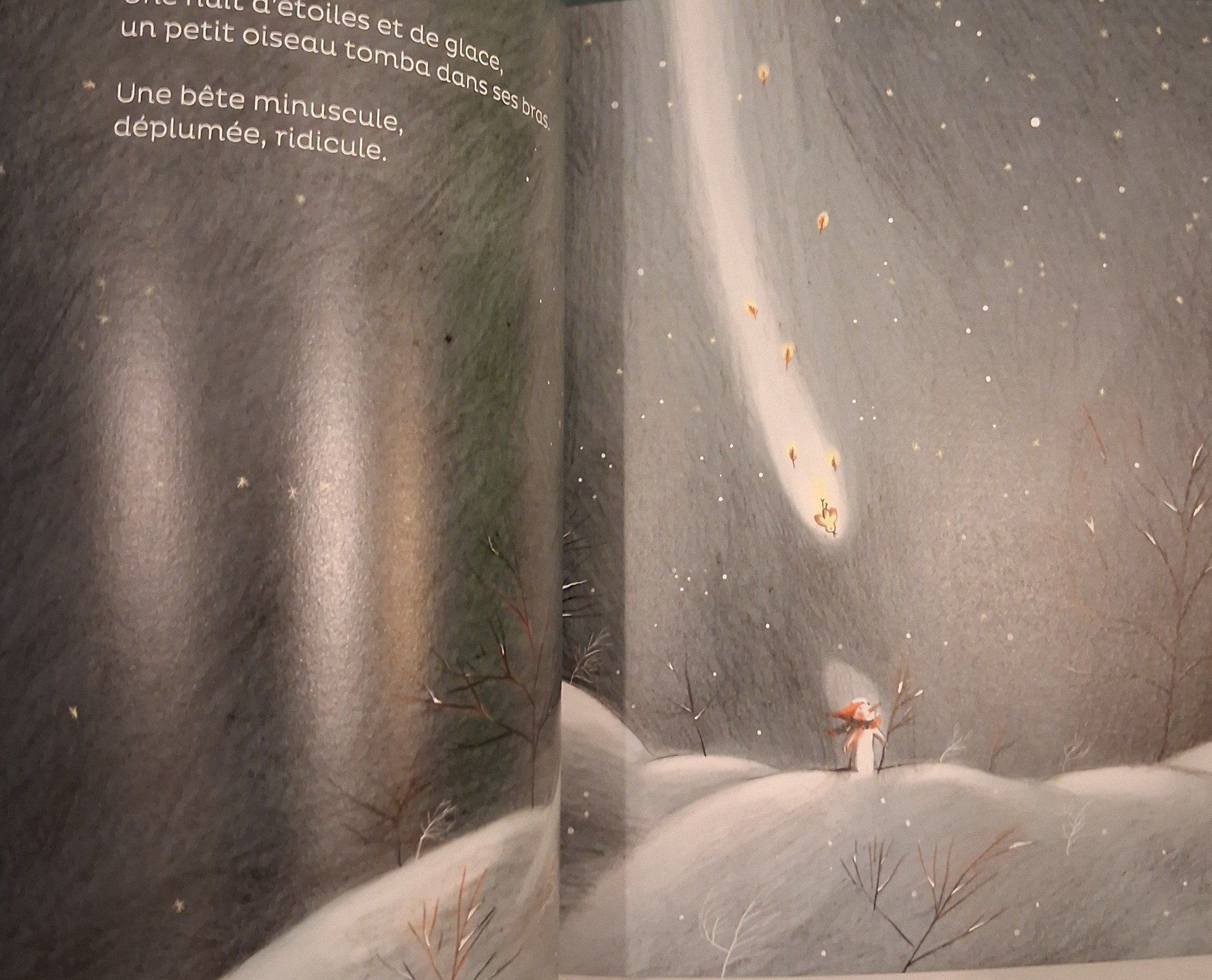 "Au coeur d'un hiver terriblement froid, un bonhomme de neige trônait comme un roi. Une nuit d'étoiles et de glace, un petit oiseau tomba dans ses bras.