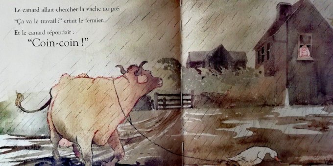 "Il était une fois un canard qui vivait avec un fermier très paresseux. Le canard s'épuisait au travail. Le fermier grossissait dans son lit. Une telle situation ne pouvait plus durer…"