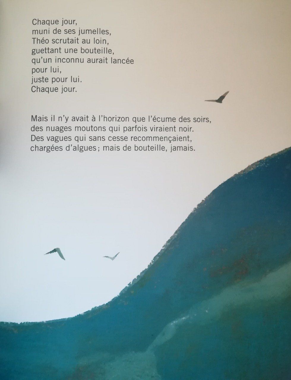 Depuis qu'il a confié le plus tendre des messages à une bouteille lancée à la mer, Théo surveille l'horizon... Il vit au rythme des marées puis des saisons. Mais l'Océan a ses mystères et réserve bien des surprises au petit garçon...