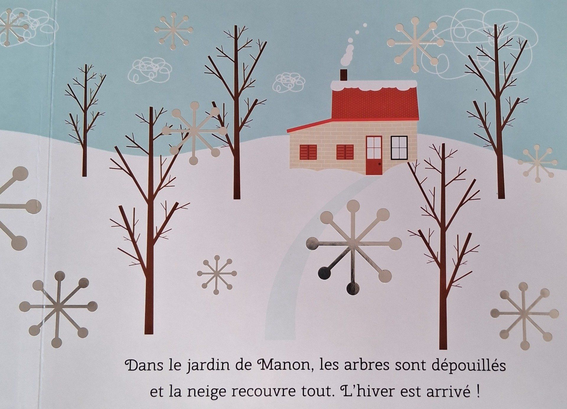 Comment sont les arbres en hiver ? Et quels sont les vêtements que Manon doit porter pour jouer dehors ? Une petite histoire toute simple rythmée par la saison et habillée de jolies matières brillantes.