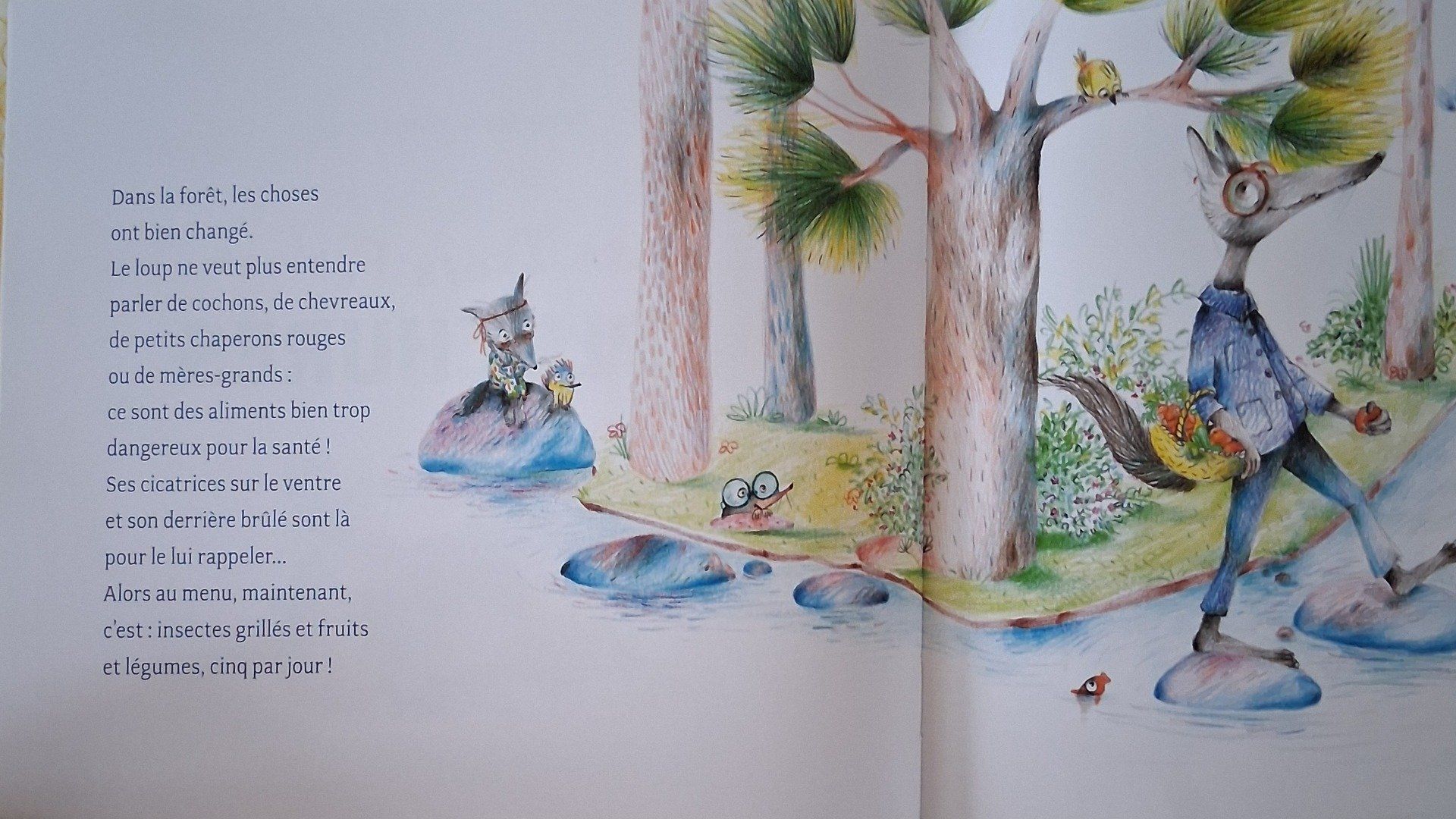 Pour le loup, la chasse, c'est terminé ! C'est beaucoup plus simple de manger des légumes. Sa petite louve boude devant son assiette et, depuis un moment, elle jette ses restes par la fenêtre... Avec cette terre fertile, de beaux concombres et tomates ont poussé. Quel potager ! Les Trois Petits Cochons sont bien intrigués !