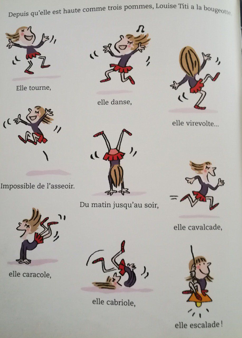 "Louise Titi est une adorable petite fille qui n'a qu'un défaut : elle a la bougeotte ! Ses parents, sa maîtresse, sa mamie, son dentiste en ont le tournis... Elle a le diable au corps : a-t-elle avalé des ressorts ? Mais Louise Titi a un secret : plus tard, elle sera acrobate ou trapéziste, et là, ses parents, sa maîtresse, sa mamie, son dentiste, tout le monde l'applaudira !"