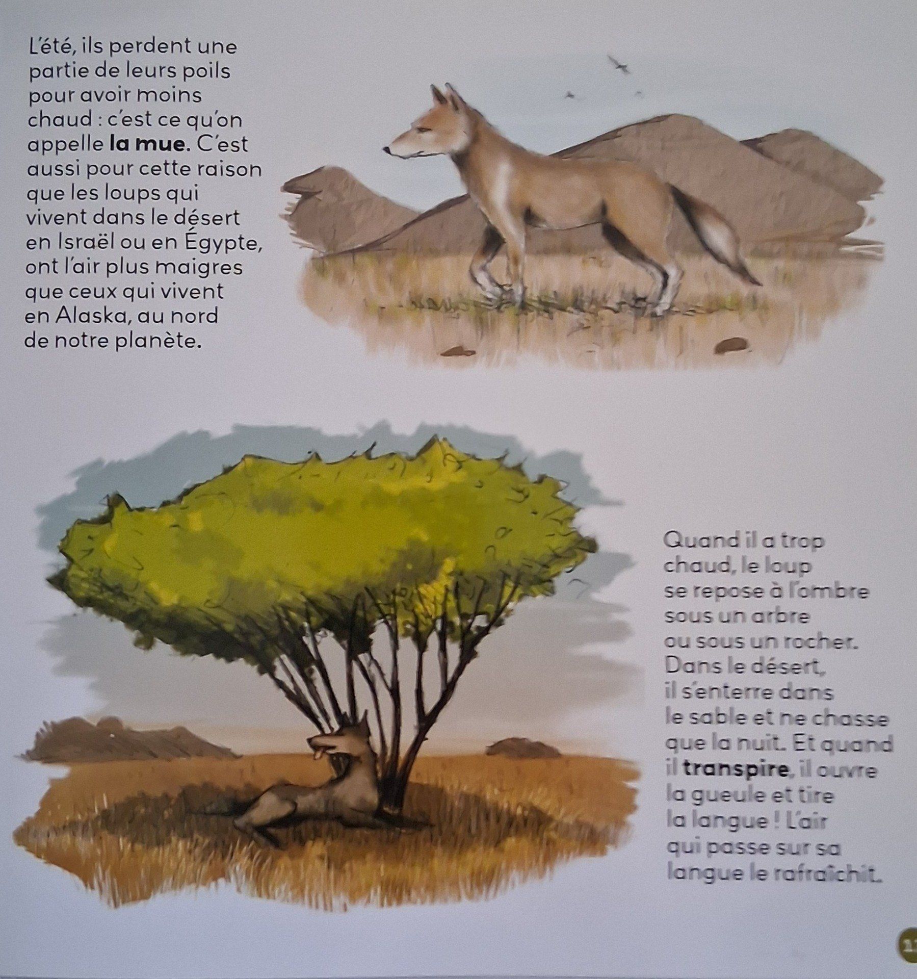 "Si les loups ne peuplent plus nos bois et nos campagnes, ils sont toujours bien présents dans nos contes et comptines et traversent nos imaginaires c"omme naguère, les plaines enneigées. Les loups ne mangent ni les enfants, ni leur grand-mère. Dès la préhistoire ils étaient domestiqués. De la même famille que les chiens, il n'est pas plus méchant... mais bien plus sauvage. C'est quoi la différence entre un chien et un loup? Est-ce que les loups sont méchants? Où est-ce qu'ils habitent? Comment font-ils pour vivre tout le temps dehors? Pourquoi les loups ont de grandes dents? Est-ce qu'ils peuvent mordre très fort? Qu'est ce qu'ils mangent? Est-ce qu'ils courent vite? Comment font-ils pour ne pas se perdre?..."