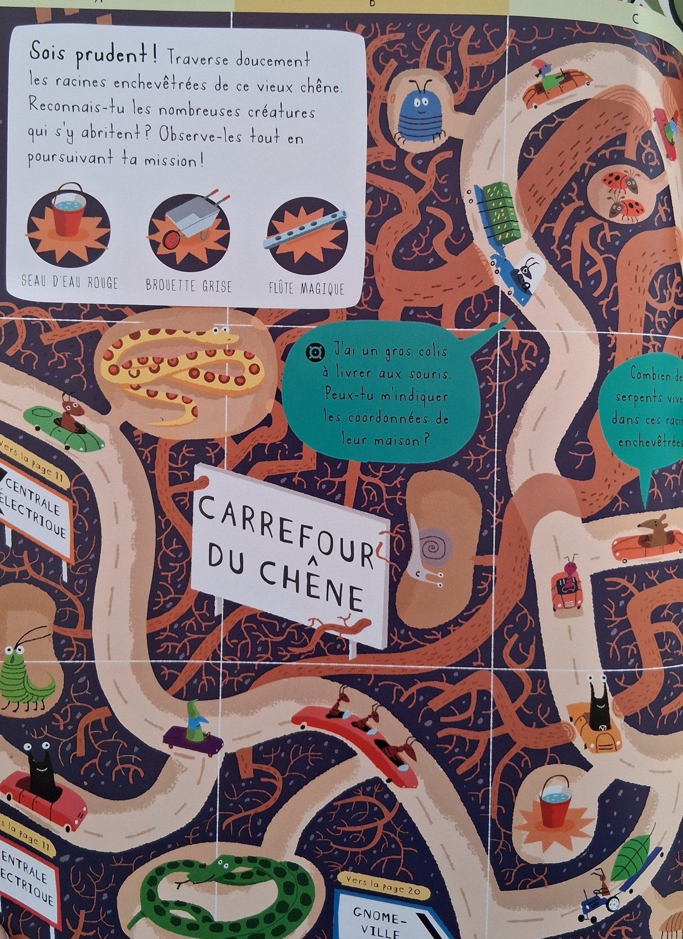 Prêt pour ta grande mission ? Rejoins les gnomes dans leur monde souterrain et aide-les à récupérer le trésor que le dragon leur a volé. Traverse les 12 labyrinthes géants en répondant aux questions des habitants et retrouve les objets cachés à chaque page pour réussir ta mission ! Un livre interactif pour apprendre à se repérer sur une carte, s'entraîner à compter et développer son sens de l'observation, tout en s'amusant !