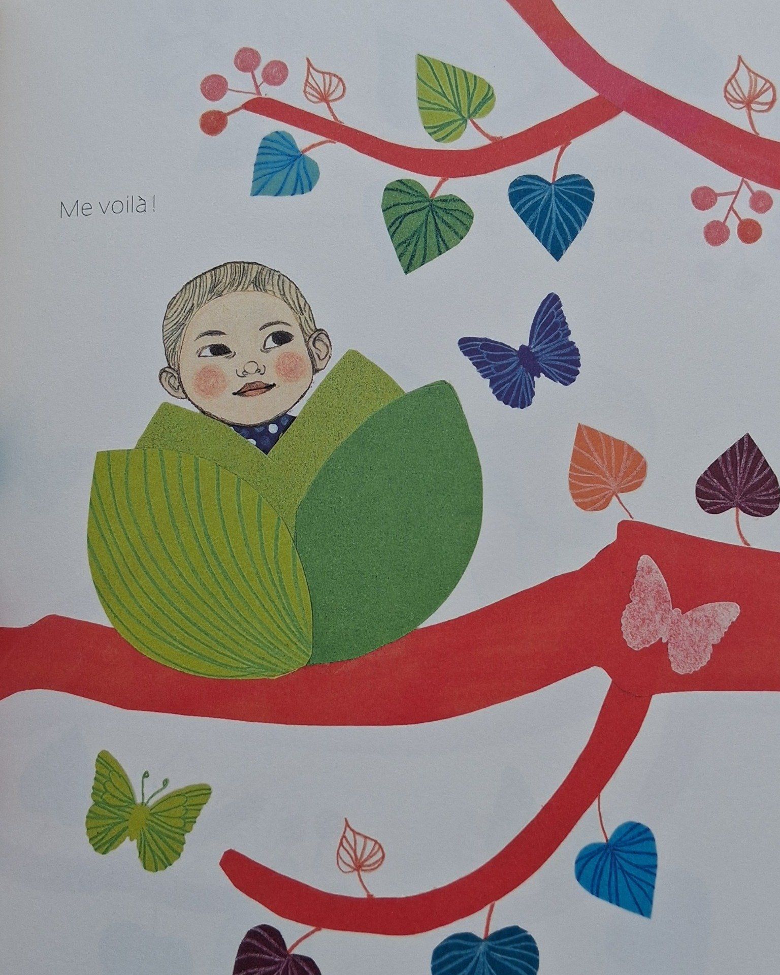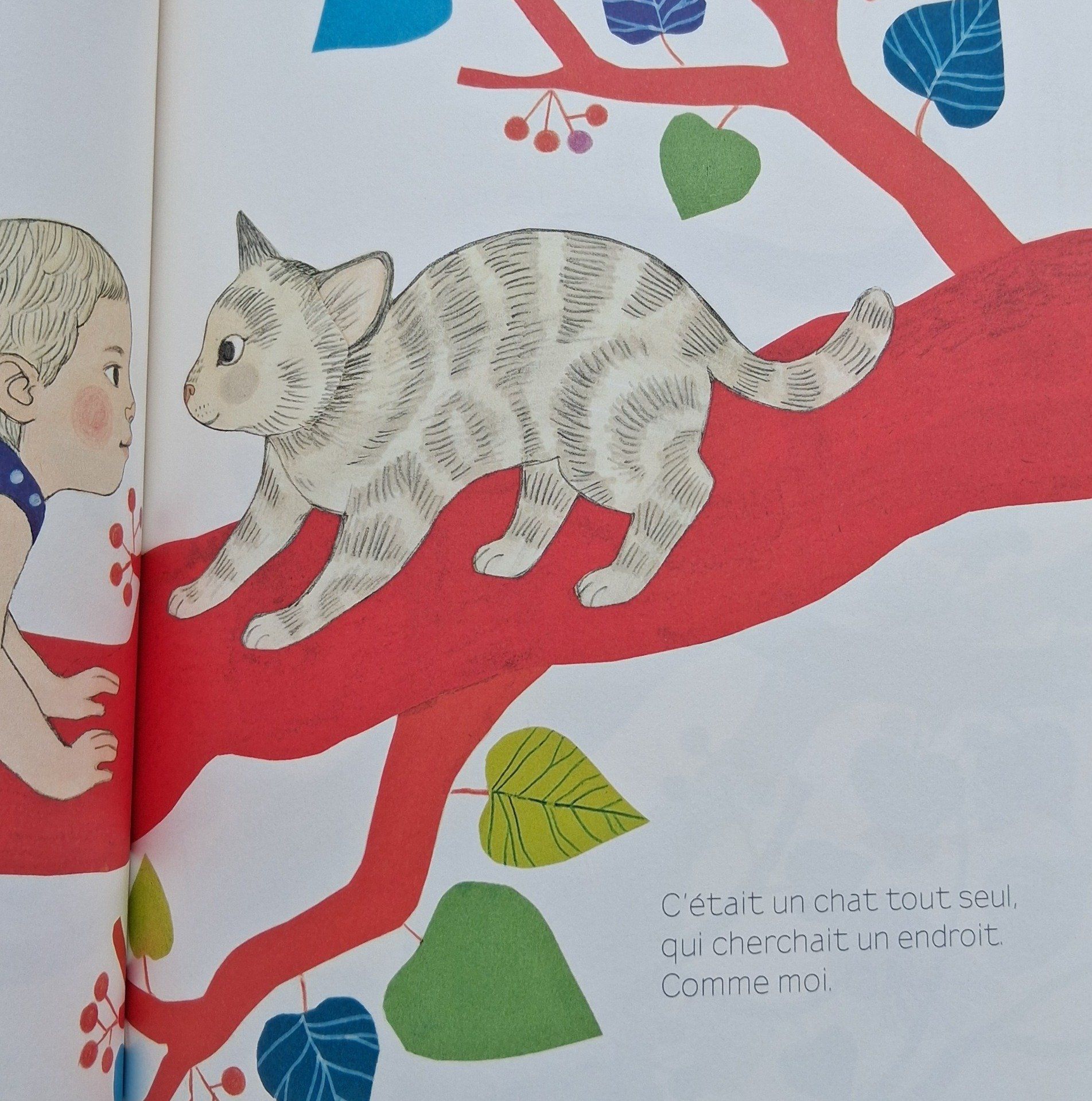 Dans le décor d'un arbre aux feuilles multicolores, un bébé fraîchement sorti de son cocon part en quête d'un "nouvel endroit" où il se sentirait moins à l'étroit. En compagnie de son ami le chat, il passe d'une "maison" à l'autre : le tronc de la chouette trop petit, le terrier des loirs trop noir... Finalement, l'enfant, un peu fatigué, trouve une paire de bras qui le mènent "au plus beau des endroits (...) un endroit parfait pour lui et pour son chat ! " .