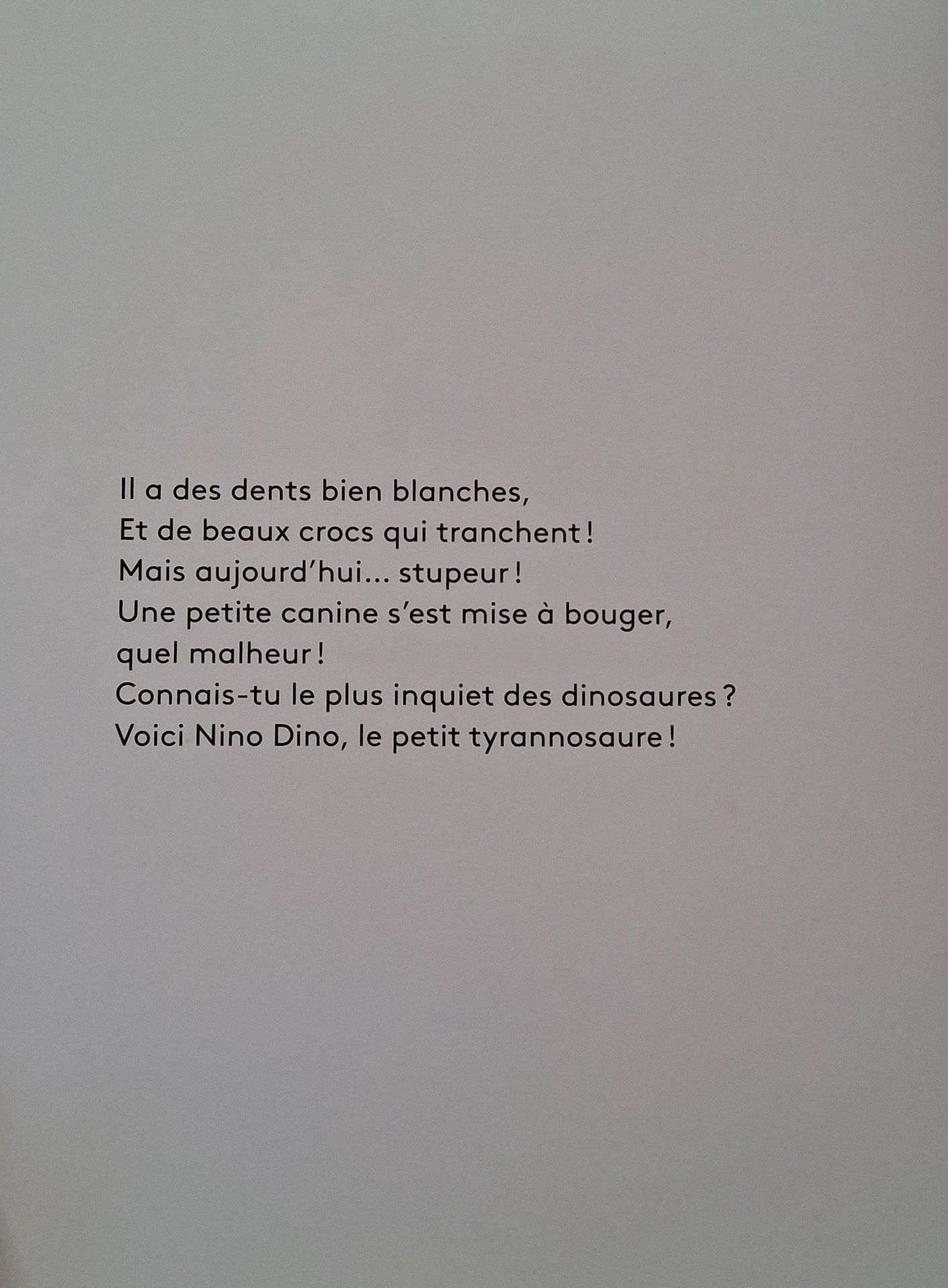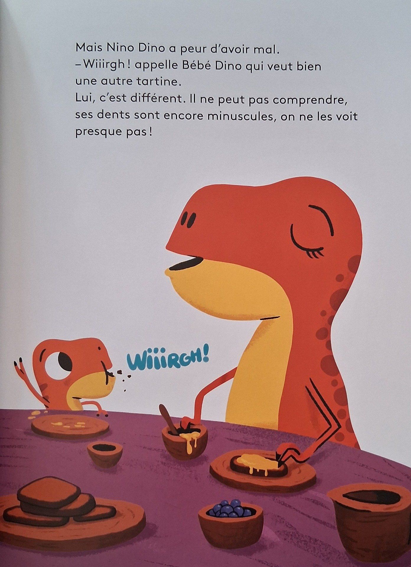 Nino Dino a une dent qui bouge ! C'est une catastrophe : le petit tyrannosaure a peur que ça fasse mal, a peur de l'avaler, il a même peur de devenir sourd (car le vieux M. Fossile, qui a perdu toutes ses dents, est sourd ! ), alors impossible pour lui de manger, de se brosser les dents et même de jouer. Entre peur et envie de grandir, Nino Dino ne sait plus quoi faire.