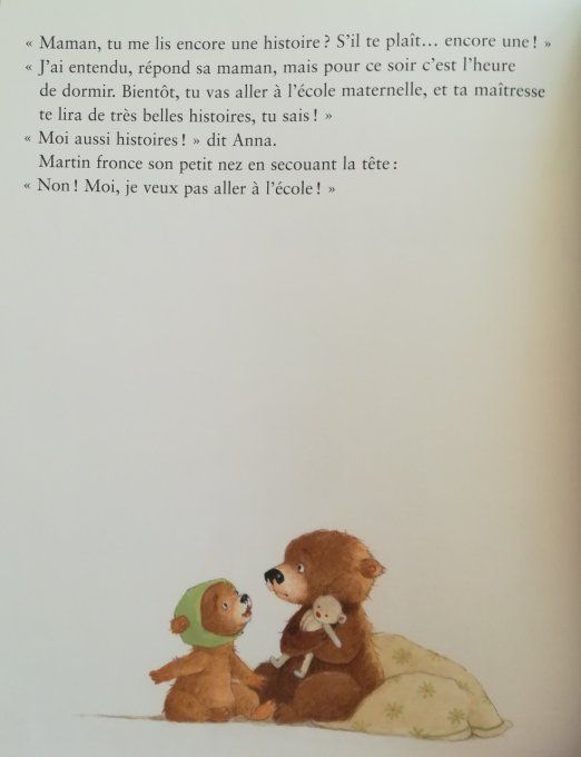Martin, Le petit ours, aimerait tellement être encore petit, et Anna, sa soeur, aimerait tellement être déjà grande ! Martin s'inquiète à l'idée que, dans quelques temps, il devra pour la première fois aller à l'école. Il cherche à convaincre ses parents qu'il est encore bien trop petit pour ça. Ses parents l'aident alors à se préparer à cette nouvelle étape. Quant à sa petite soeur ? Elle préfèrerait y aller à sa place !