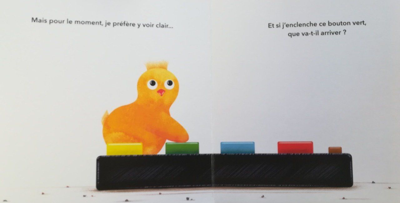 CLIC ! Pipiou vient de découvrir un objet vraiment étrange... Une boite noire avec des boutons colorés ! Pipiou, comme tout petit poussin qui se respecte, est très curieux... Allez, le voilà qui appuie sur le premier bouton. CLIC ! Oups ! Il fait tout noir maintennat... CLAC ! Retour à la lumière. Et ce bouton vert ? Que va-t-il se passer si Pipiou appuie dessus ? CLIC ! Ouh là ! Ce bouton met le monde à l'envers ! Que se passera-til avec les autres boutons ?