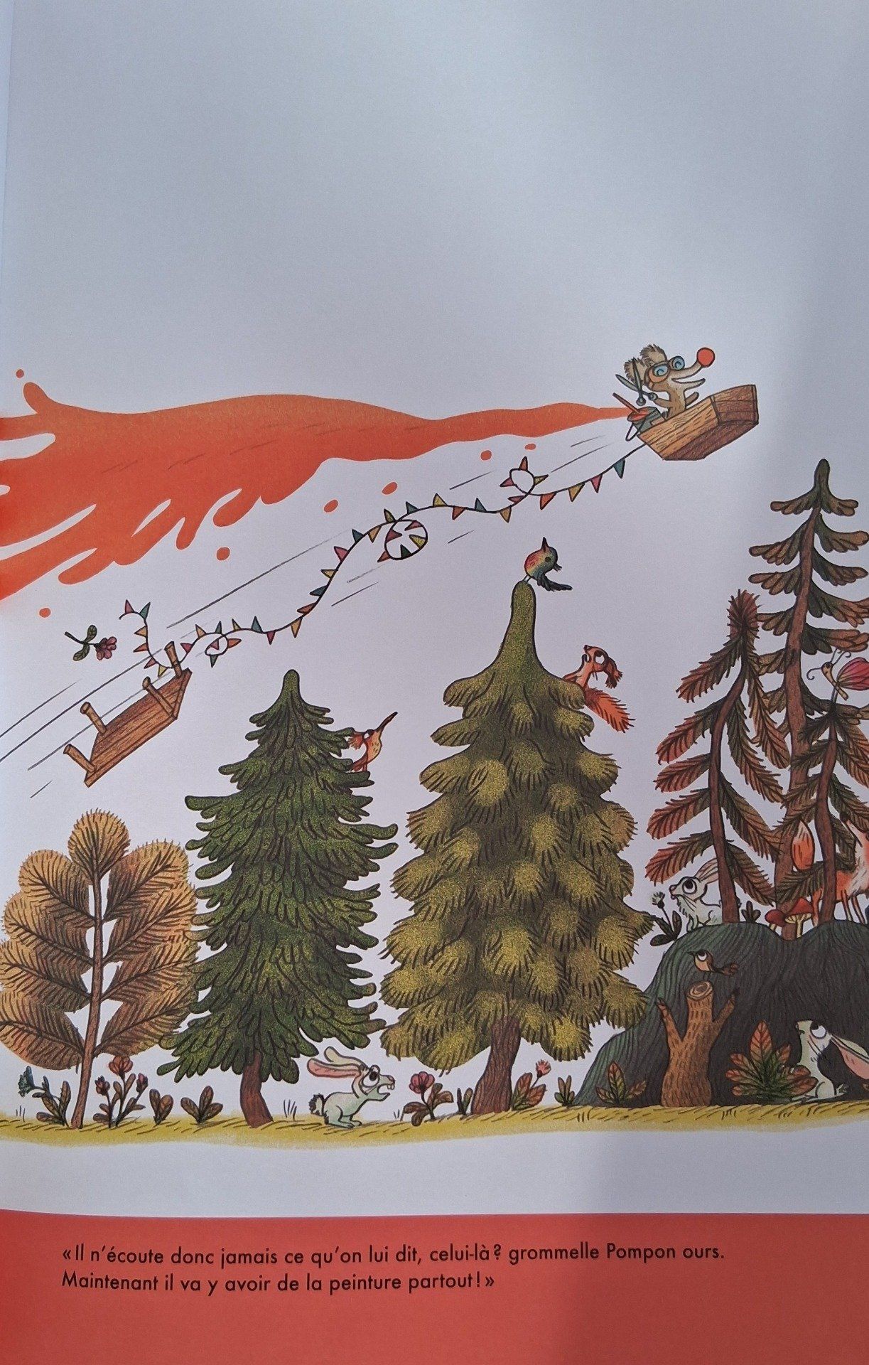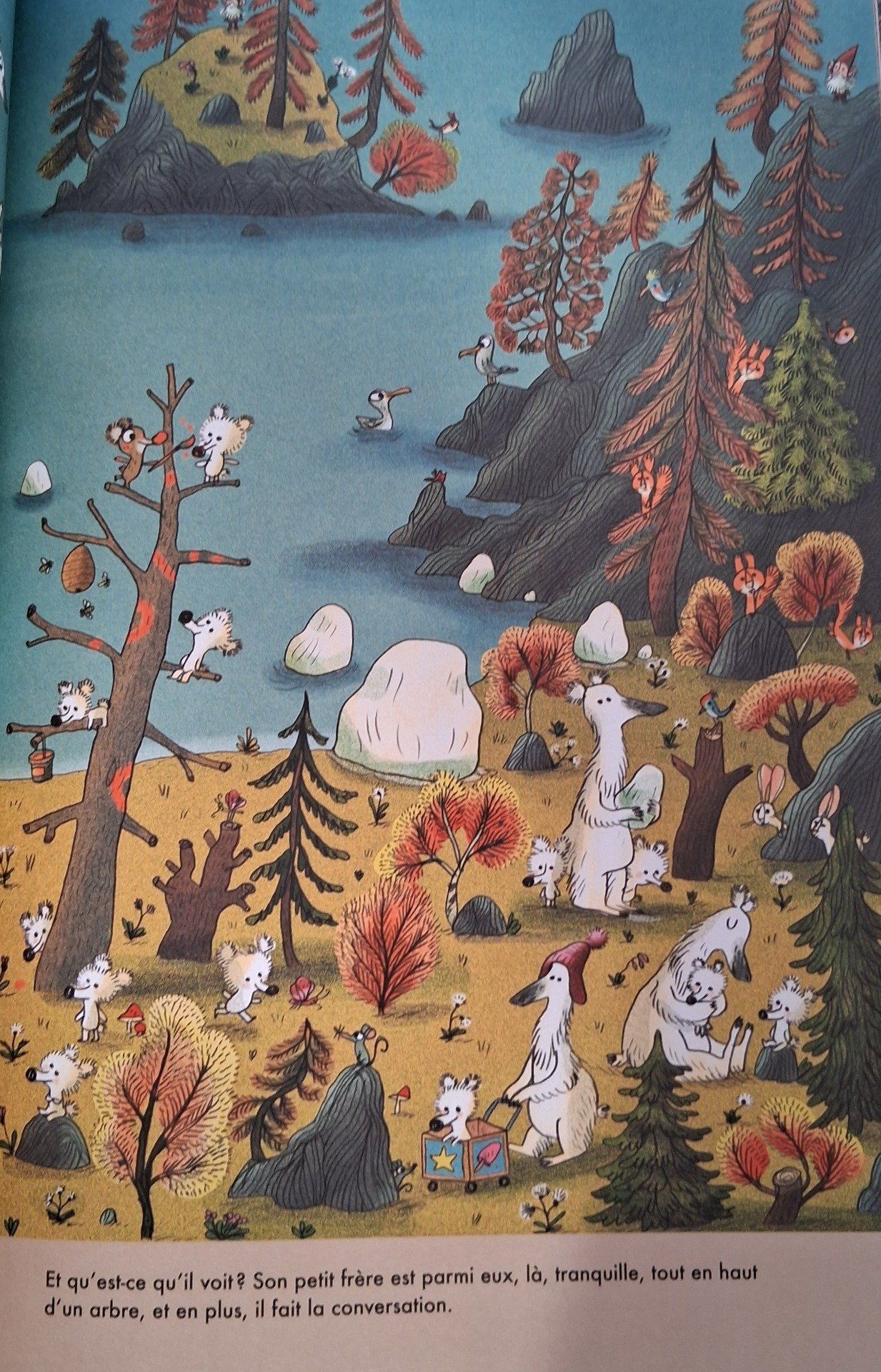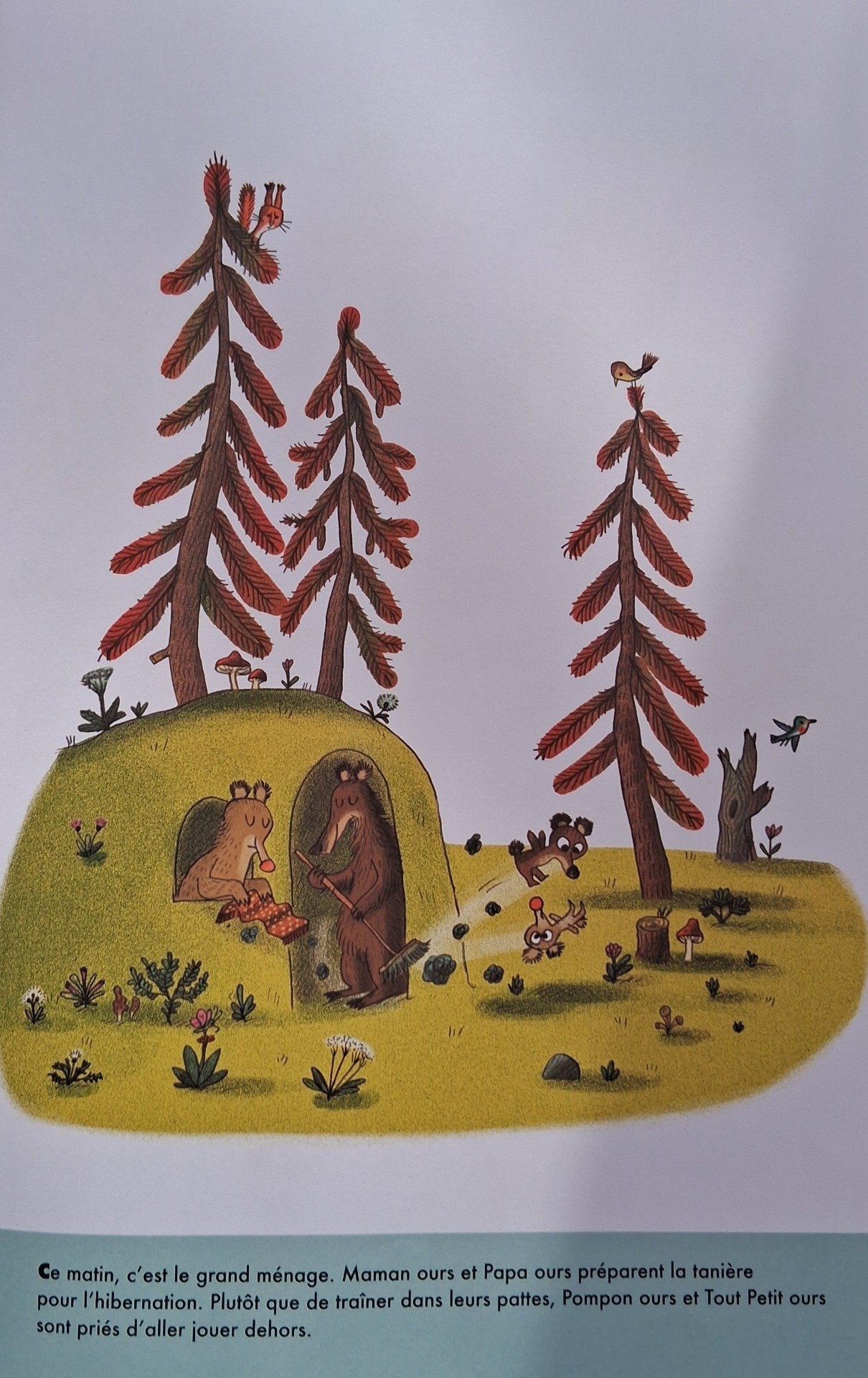 Avoir un petit frère, les grands le savent, est une calamité : ils ne font que des bêtises ! C’est le drame de Pompon ours. Pendant que les parents préparent la maison pour l’hibernation, les enfants sont « priés d’aller jouer dehors » et « Pompon ours doit s’occuper de son petit frère ».