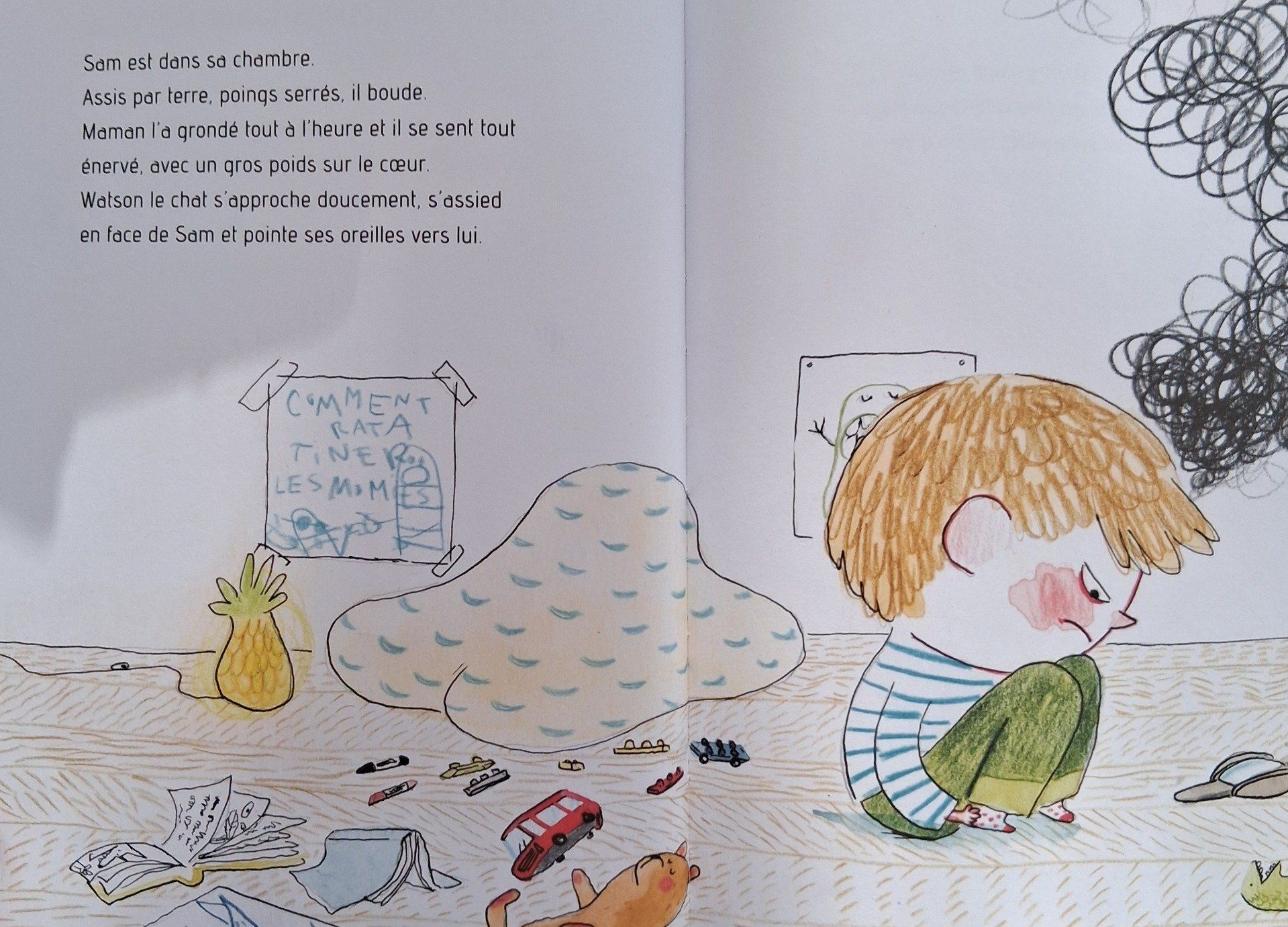 Quand on est petit, on pique parfois de grosses colères ! D'où ça vient, la colère, et comment la faire disparaître ? Alors que Sam est en train de bouder dans sa chambre, son chat Watson va lui montrer un sacré tour de magie : comment transformer son humeur orageuse en un ciel dégagé et radieux ! Une lecture sensible et tout en bienveillance pour aborder de manière dédramatisée la gestion des émotions et les petites crises auxquelles sont parfois sujets nos adorables têtes blondes.