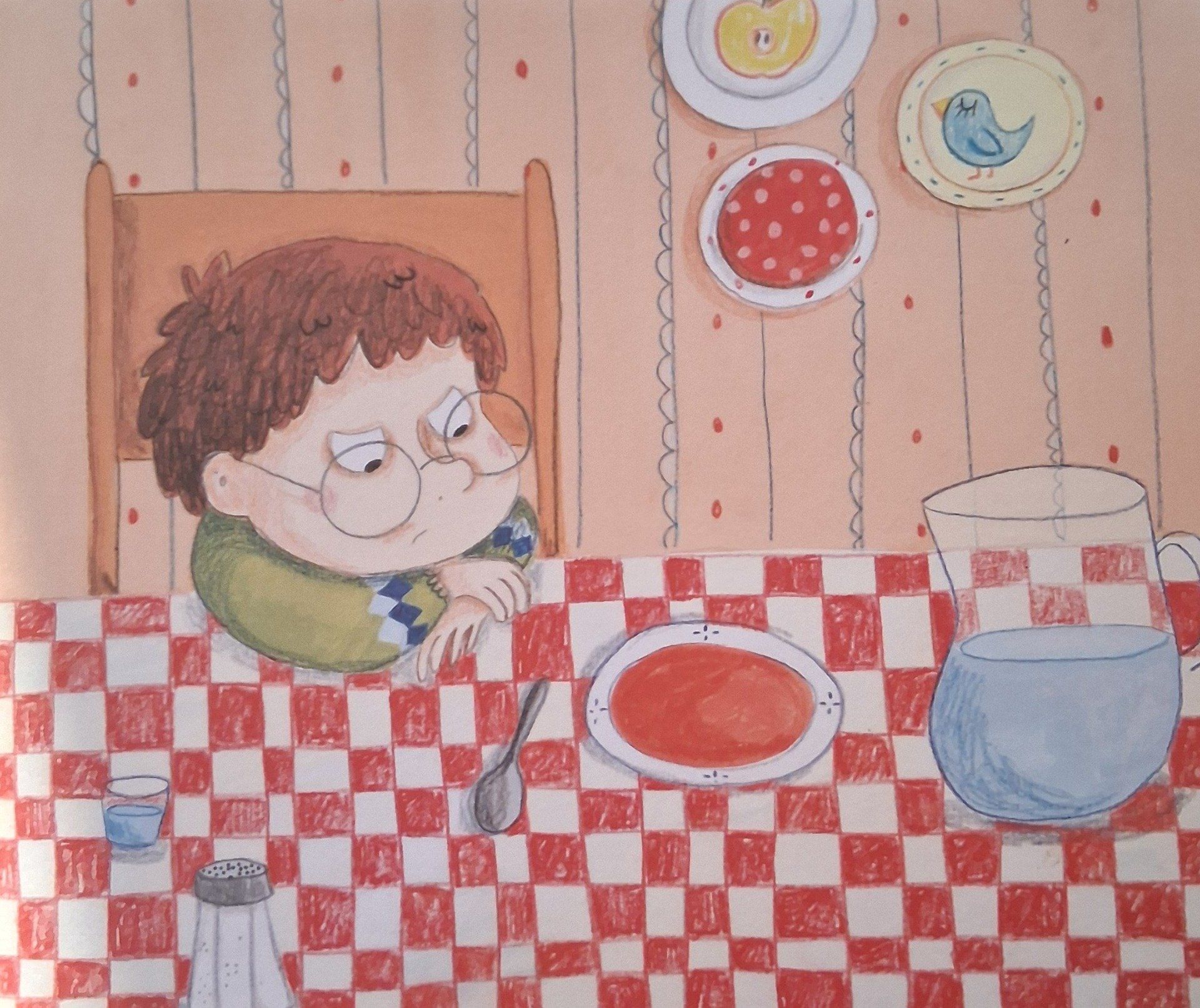 " Si tu ne manges pas ta soupe, tu auras un nez tout vert. , Si tu ne manges pas ta soupe, tu resteras tout petit. Si tu ne manges pas ta soupe, la sorcière Bougougnou te jettera un sort. Si tu ne manges pas ta soupe, des cheveux pousseront dans tes oreilles. " Quelle énergie pour arriver à faire avaler sa soupe à Louis ! Mais quand papa s'installe à table (il est tout petit, a un nez vert et des cheveux dans les oreilles), plus questions de chipoter ! Louis engloutit sa soupe et.
