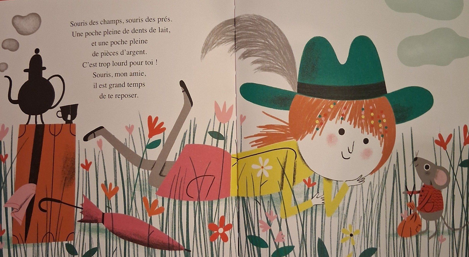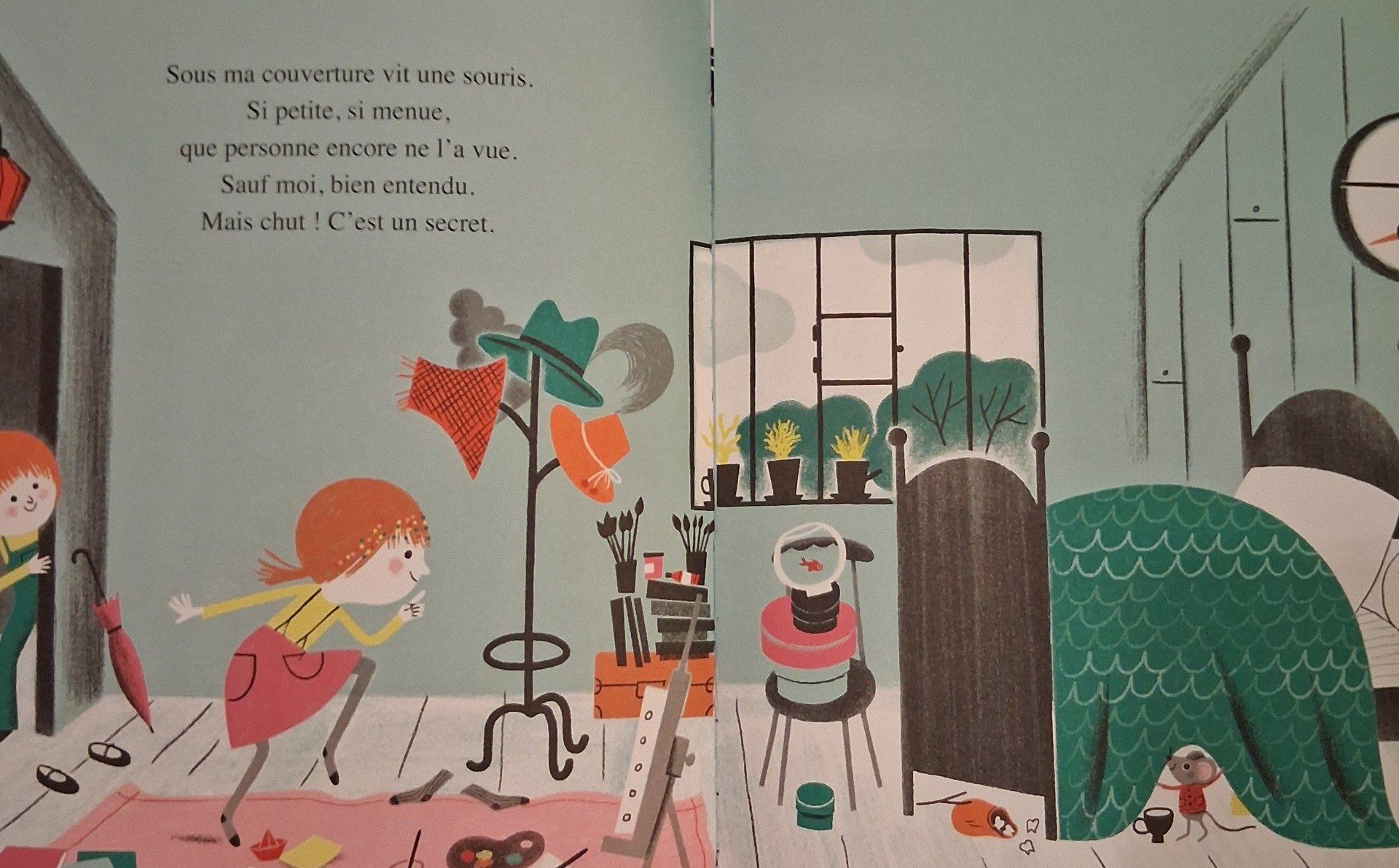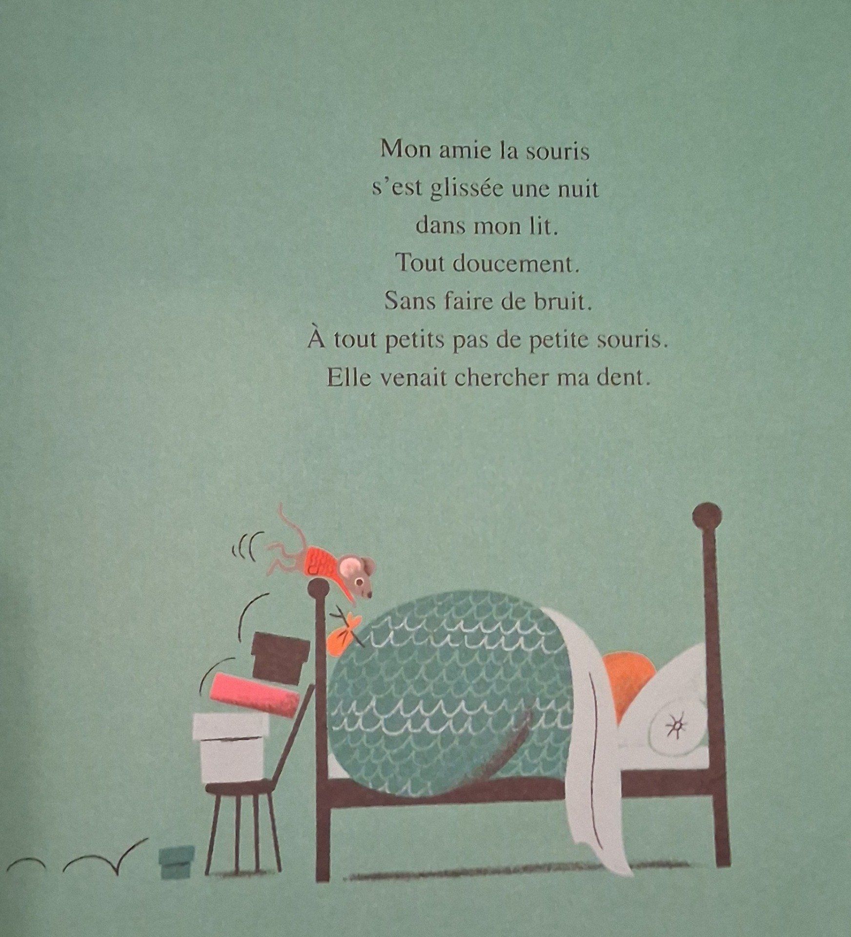 Cette fois, c'est la célèbre souris des dents qui s'est glissée, à pas de souris forcément, sous la couverture de la narratrice. Selon le principe de la série, elles deviennent amies et se chuchotent leurs secrets à l'oreille... Pour ce 4e album, la fillette de l'histoire est accompagnée ici et là des personnages principaux des trois premiers titres. Une joyeuse petite bande se forme ainsi sous nos yeux.