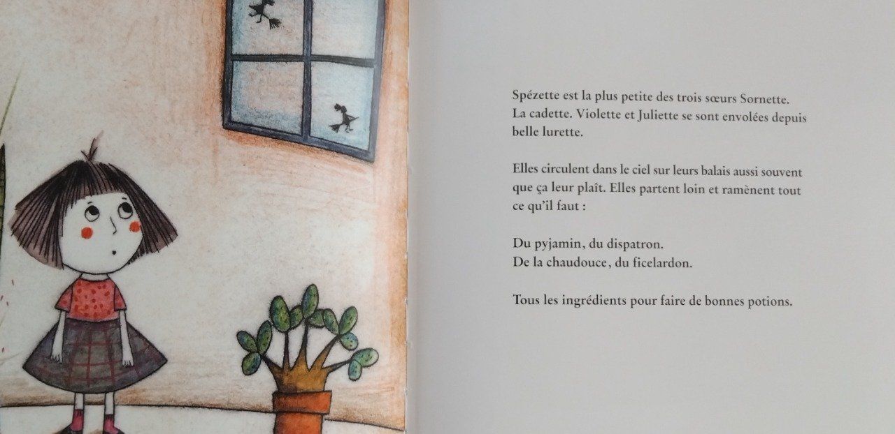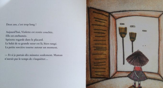 Chaque matin, Spézette regarde ses grandes soeurs s'envoler sur leurs balais. Maman, j'en ai assez de rester à la maison. J'ai passé l'âge de la dînette. Tu es trop petite pour voler toute seule. Fais un tour avec moi, je te laisserai prendre le manche. Et dans deux ans, nous en reparlerons. Mais pour Spézette, deux ans, c'est trop long...