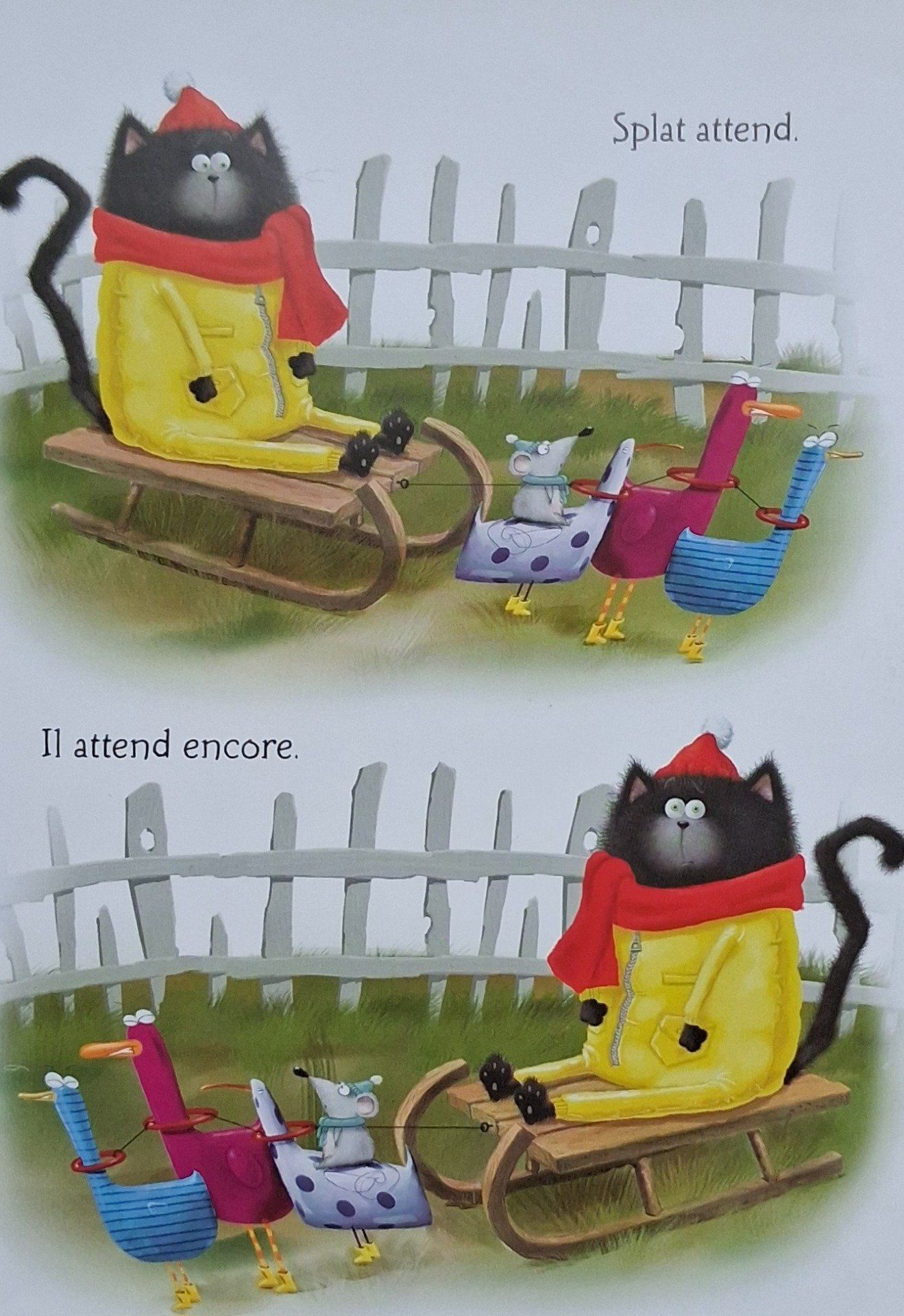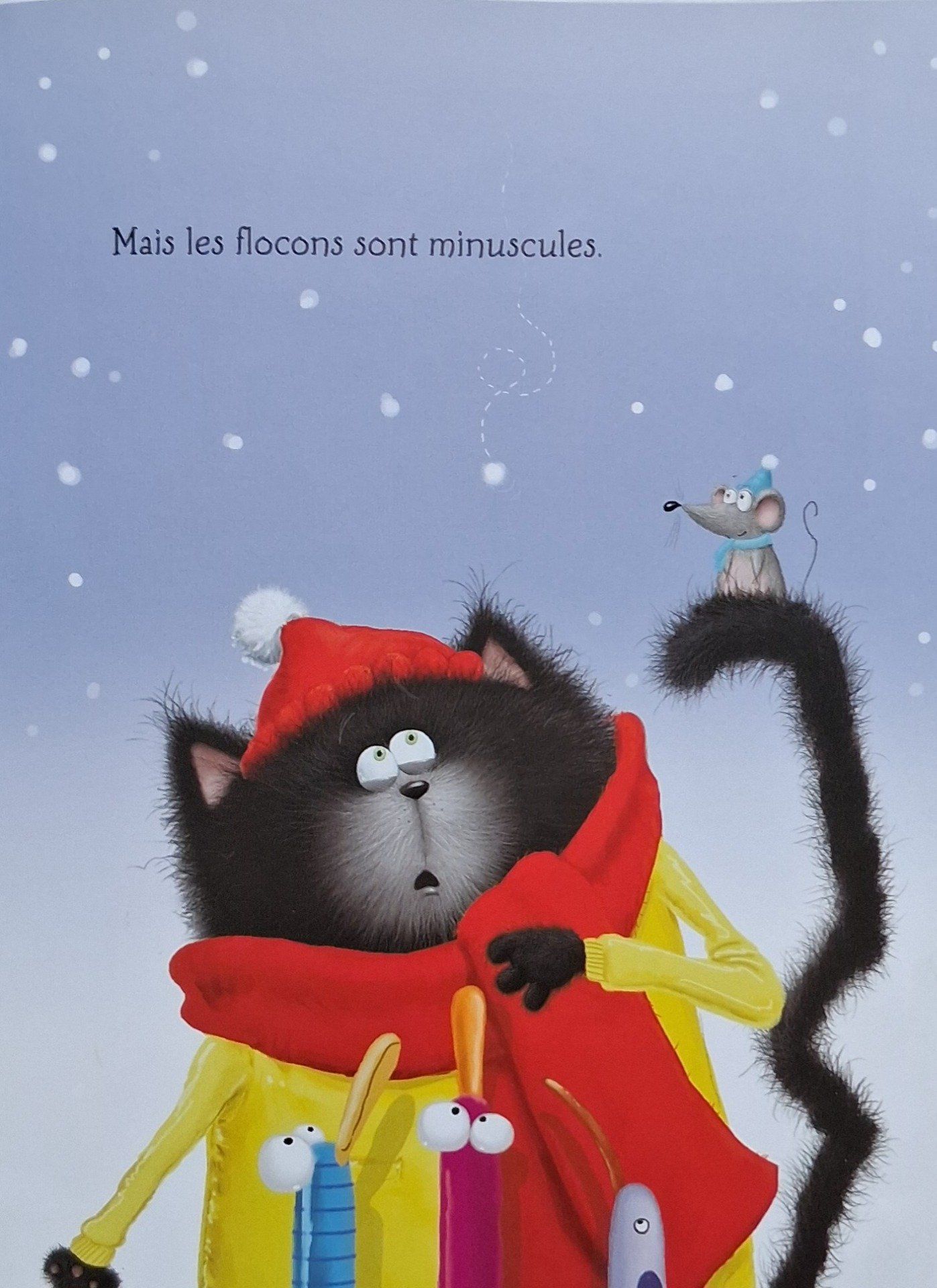 Splat veut absolument faire un chat de neige. Mais voilà, il ne neige pas ? Splat attend, attend, mais les flocons ne tombent pas...