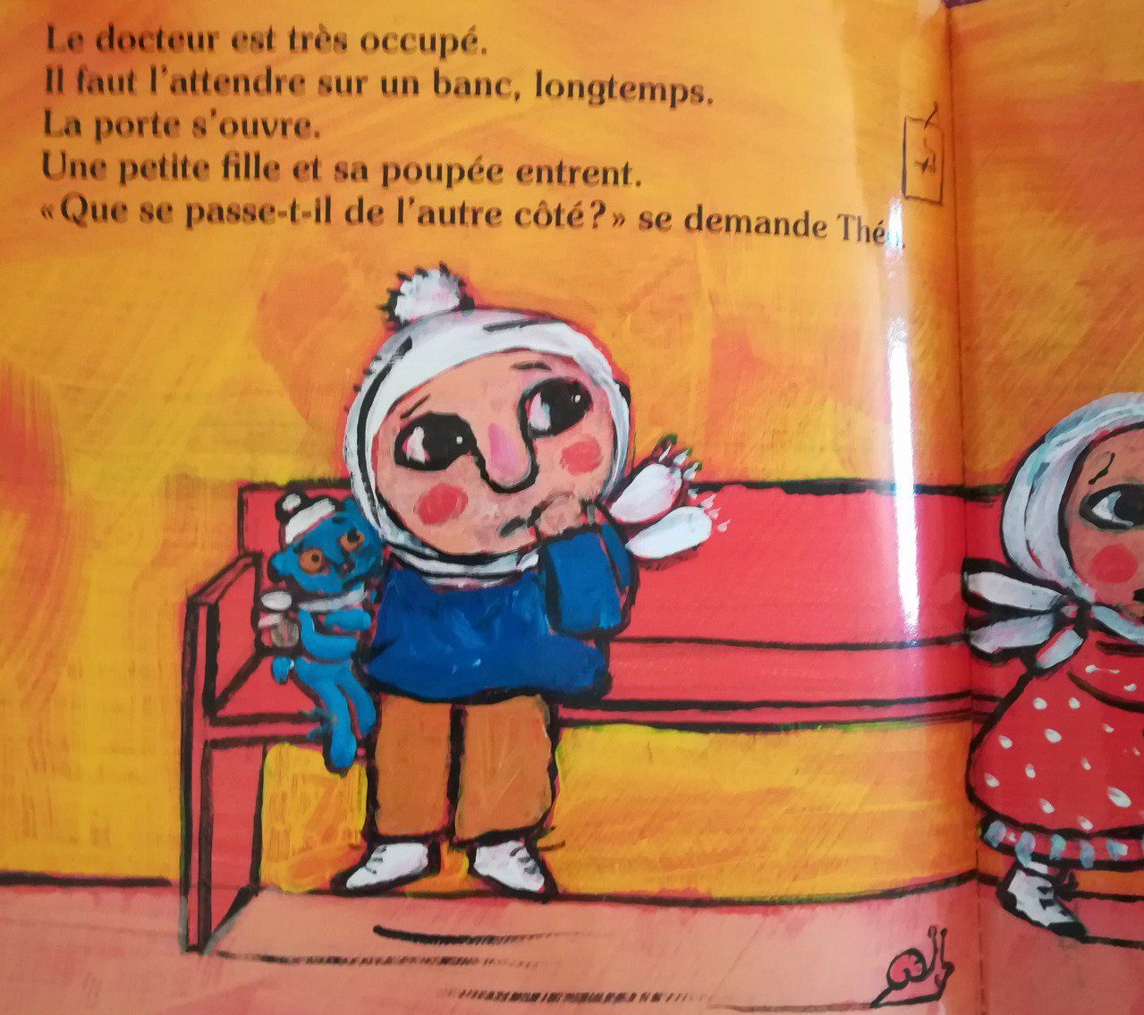 Théo ne va pas bien. Vite, chez le docteur ! Théo a un peu peur. Assis sur un banc, il attend son tour... Ça y est, c'est à lui !