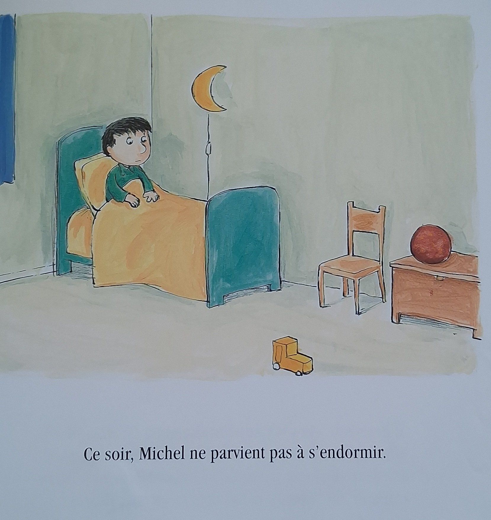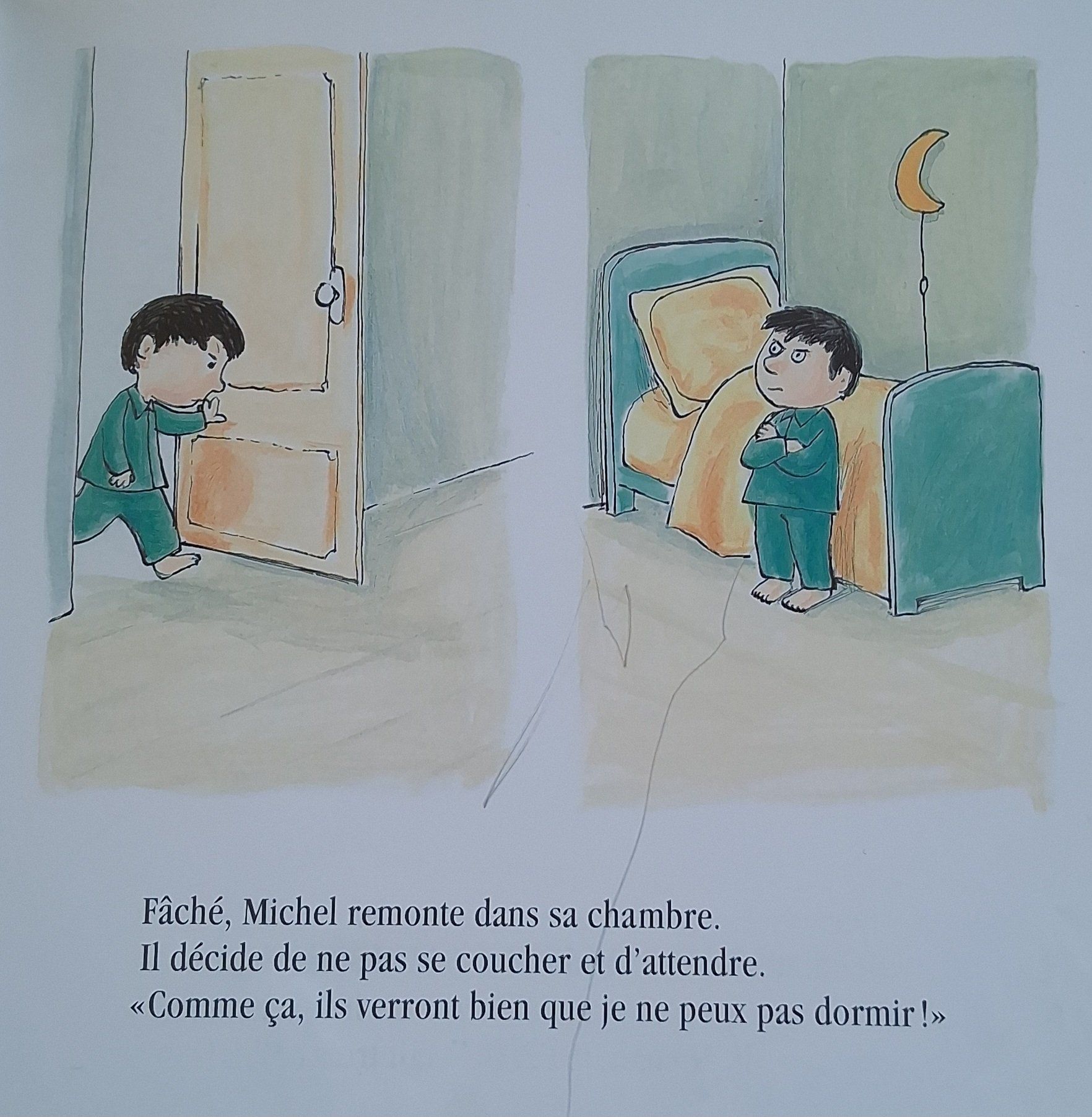 Ce soir, Michel ne parvient pas à s'endormir. " Je veux une histoire et un câlin, sinon, je ne peux pas dormir ", dit-il à ses parents. " Ah non, dit Papa, je t'ai déjà lu trois histoires ! " " Et je t'ai déjà fait trois câlins ! " dit Maman. Fâché, Michel remonte dans sa chambre. Il décide de ne pas se coucher et d'attendre.