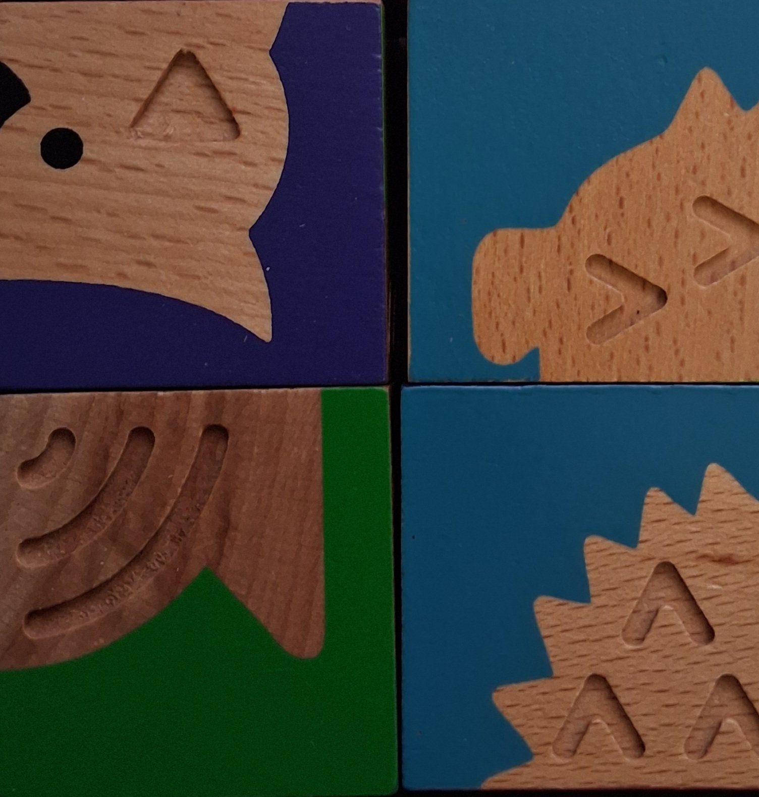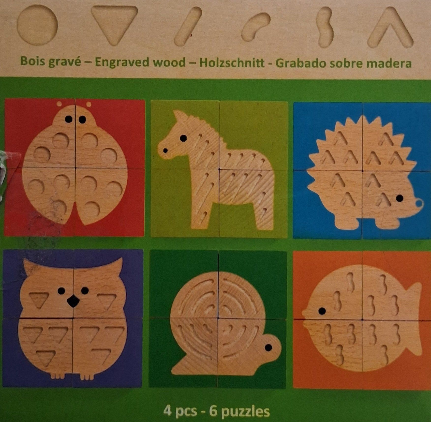 Quatre cubes en bois illustrés et gravés de motifs différents pour que l'enfant associe le visuel au toucher. En assemblant couleur et motif, l'enfant reconstitue 6 animaux.